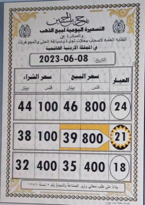 استقرت أسعار الذهب في السوق المحلي الأردن ، اليوم الخميس، بحسب تسعيرة النقابة العامة لأصحاب محلات تجارة وصياغة الحلي والمجوهرات.
