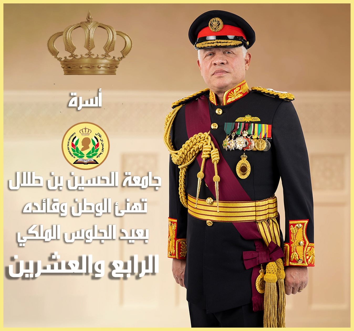 يتقدم رئيس جامعة الحسين بن طلال الأستاذ الدكتور عاطف الخرابشة باسمه واسم أسرة الجامعة، من مقام حضرة صاحب الجلالة الهاشمية الملك عبدالله الثاني ابن الحسين المعظم وولي عهده الأمين سمو الأمير الحسين بن عبدالله الثاني، بخالص التهنئة والتبريك بمناسبة عيد الجلوس الملكي الرابع والعشرين، وذكرى الثورة العربية الكبرى، ويوم الجيش.