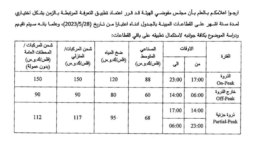 أعلن مجلس مفوضي هيئة تنظيم قطاع الطاقة والمعادن البدء بتطبيق نظام التعرفة المرتبطة بالزمن بشكل اختياري للقطاعات حيث يقوم هذا النظام على حساب التعرفة تبعًا للوقت الذي تم فيه استهلاك الطاقة خلال اليوم.