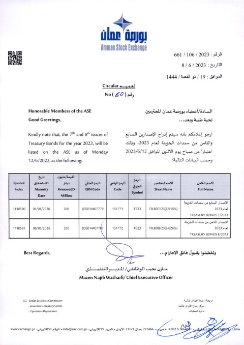 اعلنت بورصة عمّان، إدراج الإصدارين السابع والثامن من سندات الخزينة لعام 2023، وذلك اعتباراً من صباح اليوم الإثنين.