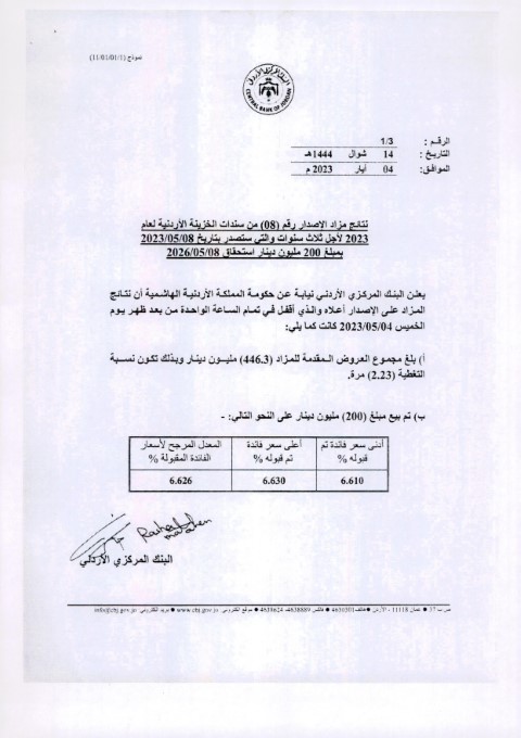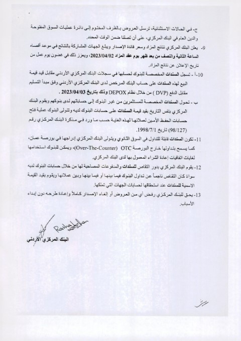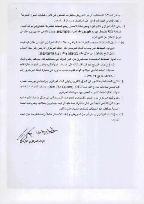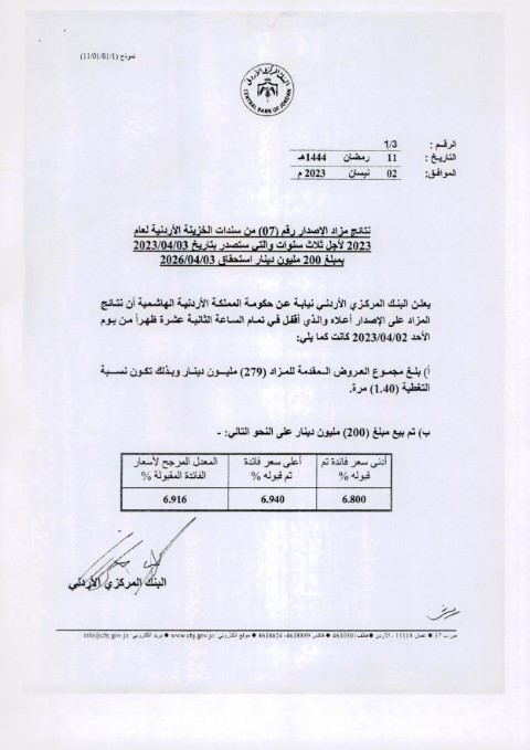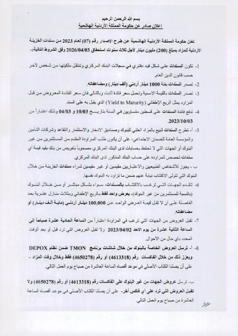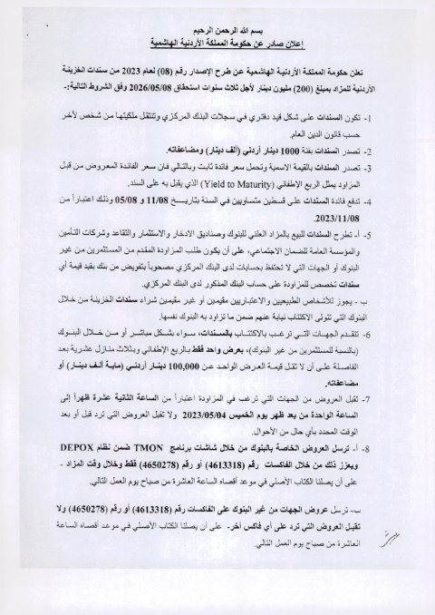 وبحسب التعميم، فإن قيمة الإصدارين من سندات الخزينة يبلغ 400 مليون دينار، وبتاريخ استحقاق 3 نيسان 2026، و8 أيار 2026، على التوالي.