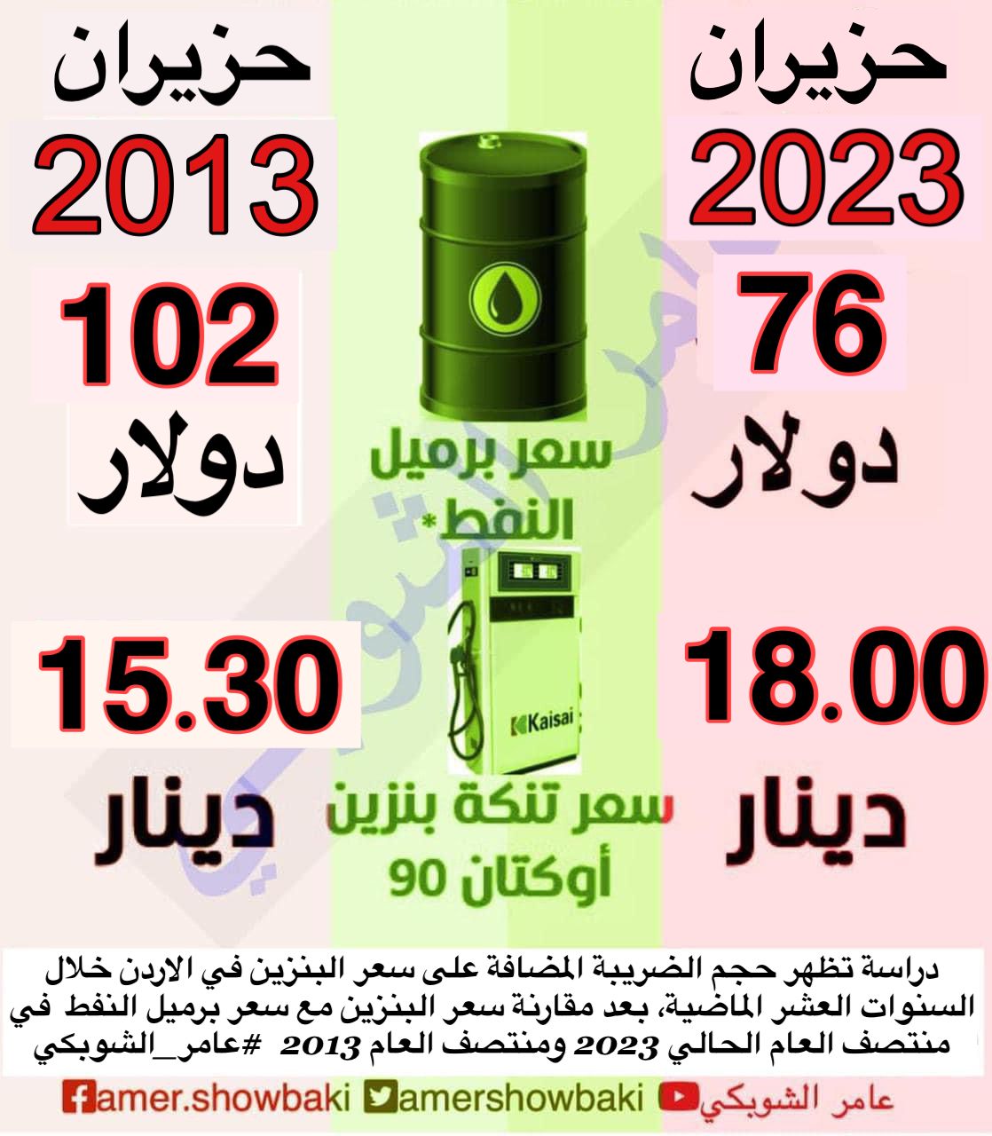 قال الخبير الاقتصادي المتخصص في شؤون الطاقة والنفط عامر الشوبكي، إن دراسة أجراها مؤخراً، تظهر حجم الضريبة المضافة على سعر البنزين في الاردن خلال السنوات العشر الماضية، بعد مقارنة سعر تنكة البنزين مع سعر برميل النفط في منتصف العام الحالي 2023 ومنتصف العام 2013.