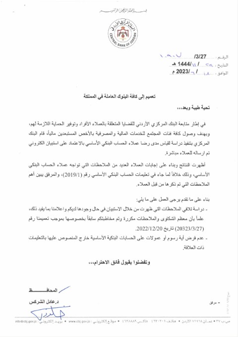 ووفق التعميم ، فقد عمم البنك المركزي، نتائج دراسة أجراها حول قياس مدى رضا عملاء الحساب البنكي الأساسي.