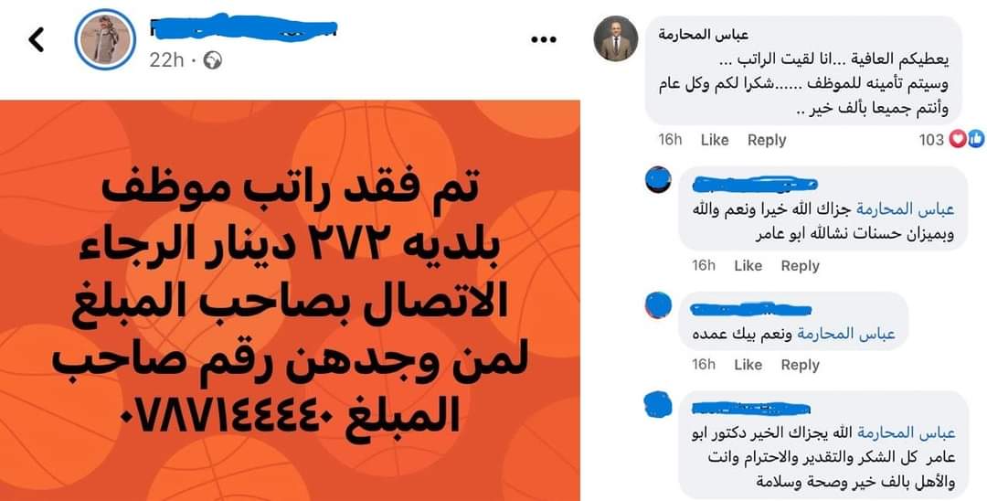 وردّ رئيس بلدية سحاب الدكتور عباس المحارمة بتعليق على المنشور يقول فيه أنه وجد الراتب وسيتم تأمينه للموظف .