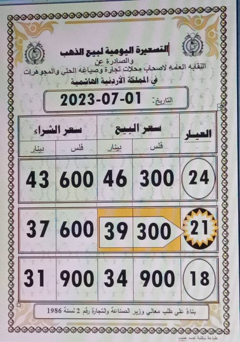 وبلغ سعر بيع غرام الذهب عيار 21 الأكثر رغبة من الأردنيين بالسوق المحلية عند 39.30 دينارا لغايات شراء المواطنين من محلات الصاغة.