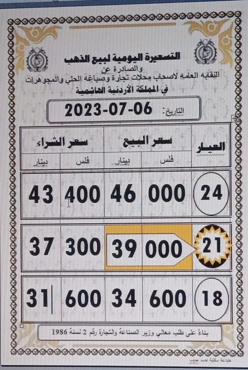 انخفضت اسعار الذهب في السوق المحلي الأردني في التسعيرة الرسمية الثانية المسائية الصادرة اليوم الخميس، والصادرة عن النقابة العامة لأصحاب محلات تجارة وصياغة الحلي والمجوهرات.