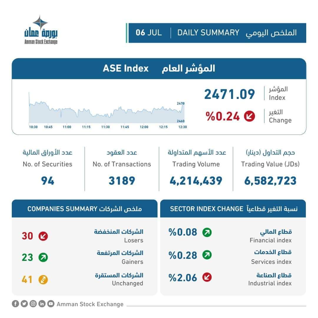 بلغ حجم التداول الإجمالي ليوم الخميس 06/07/2023 حوالي (6.6) مليون دينار وعدد الأسهم المتداولة (4.2) مليون سهم، نفذت من خلال (3,187) عقداً.