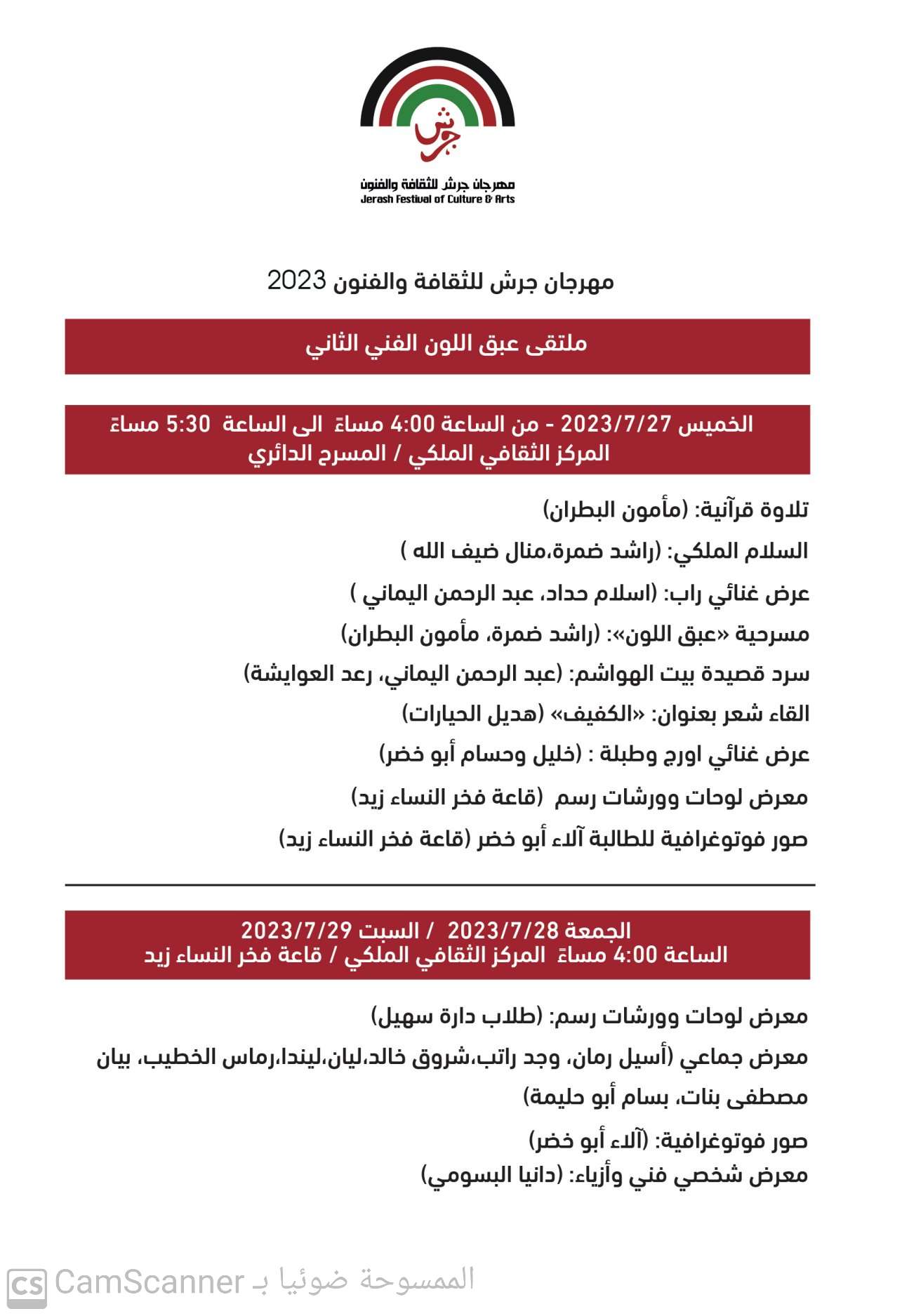 ضمن فعاليات مهرجان جرش للثقافة والفنون 2023 سيشارك ملتقى "عبق اللون" الفني الثاني بعدد من العروض والفعاليات العروض والفعاليات والتي تستمر 3ايام ابتداءا من يوم الخميس الموافق 27/7/2023 الساعة الرابعة مساء ولغاية يوم السبت 29/7/2023 على المسرح الدائري في المركز الثقافي الملكي.
