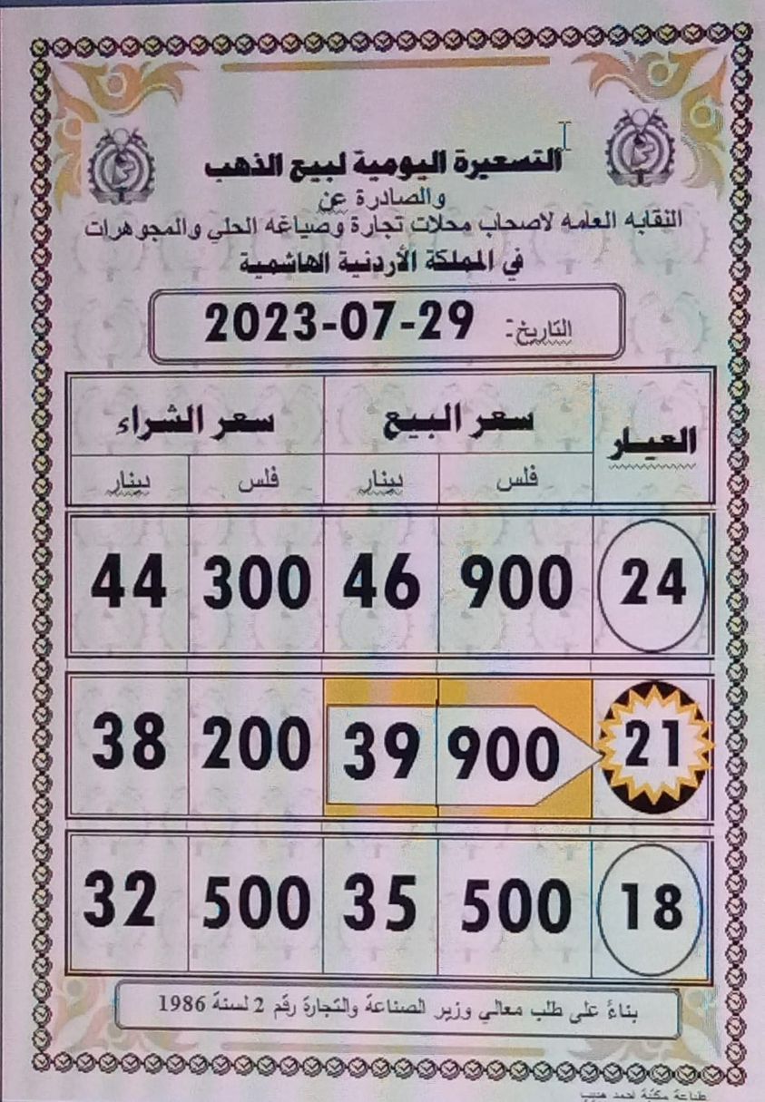 وبلغ سعر غرام الذهب عيار 21 الأكثر طلبا لدى الأردنيين، 39.90 دينارا لجهة الشراء من المحلات، مقابل 38،20 دينار لجهة البيع.