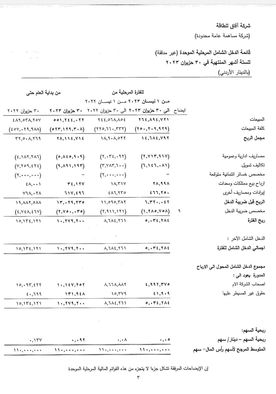 أما شركة أفاق للطقاقة للنصف الأول من عام 2023 فقط حققت 10،2 مليون دنيار مقارنة بـ15 مليون دينار من نفس الفترة من العام الماضي .