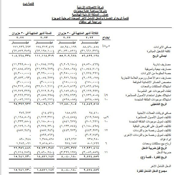 وجاءت تفاصيل نتتائج شركة الاتصالات الأردنية كما يلي: