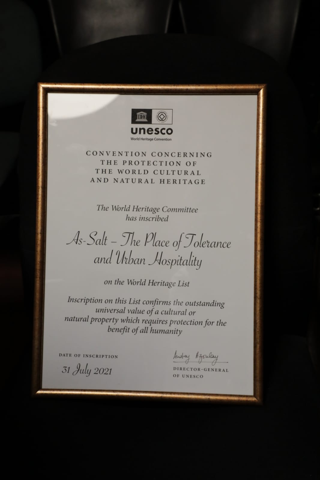 وكانت قد وافقت لجنة التراث العالمي التابعة لمنظمة الأمم المتحدة للتربية والعلوم والثقافة (اليونسكو)، خلال دورتها الرابعة والأربعين المنعقدة في الصين افتراضيا عام 2021، على إدراج مدينة السلط "مدينة التسامح والضيافة الحضارية" على قائمة التراث العالمي.