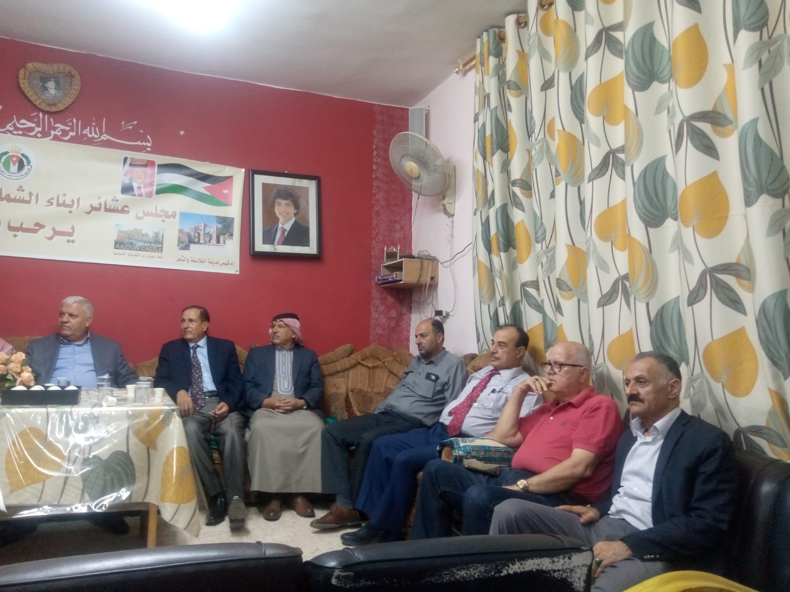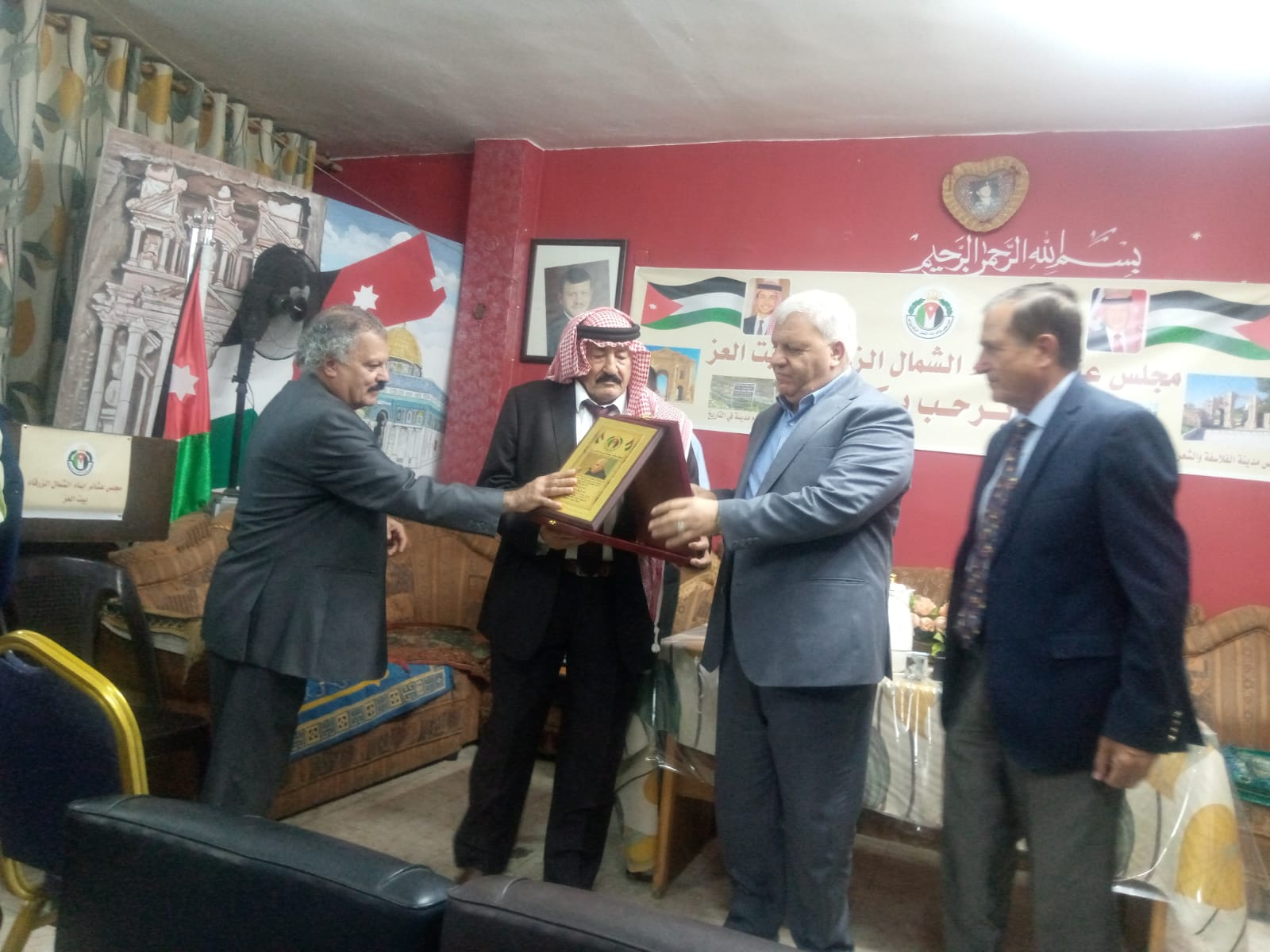 كرم أعضاء مجلس عشائر أبناء الشمال بيت العز النائب محمد موسى الغويري بدرع المجلس خلال توقيع وثيقة لا للعيارات النارية بالمناسبات والافراح لا لاغلاق الطريق بمواكب الناجحين او الاعراس واعلان ميثاق شهامة لا مشاركة بفرح (لأ) يلتزم بمقاطعة العيارات النارية والمواكب المعيقة لحركة المرور.