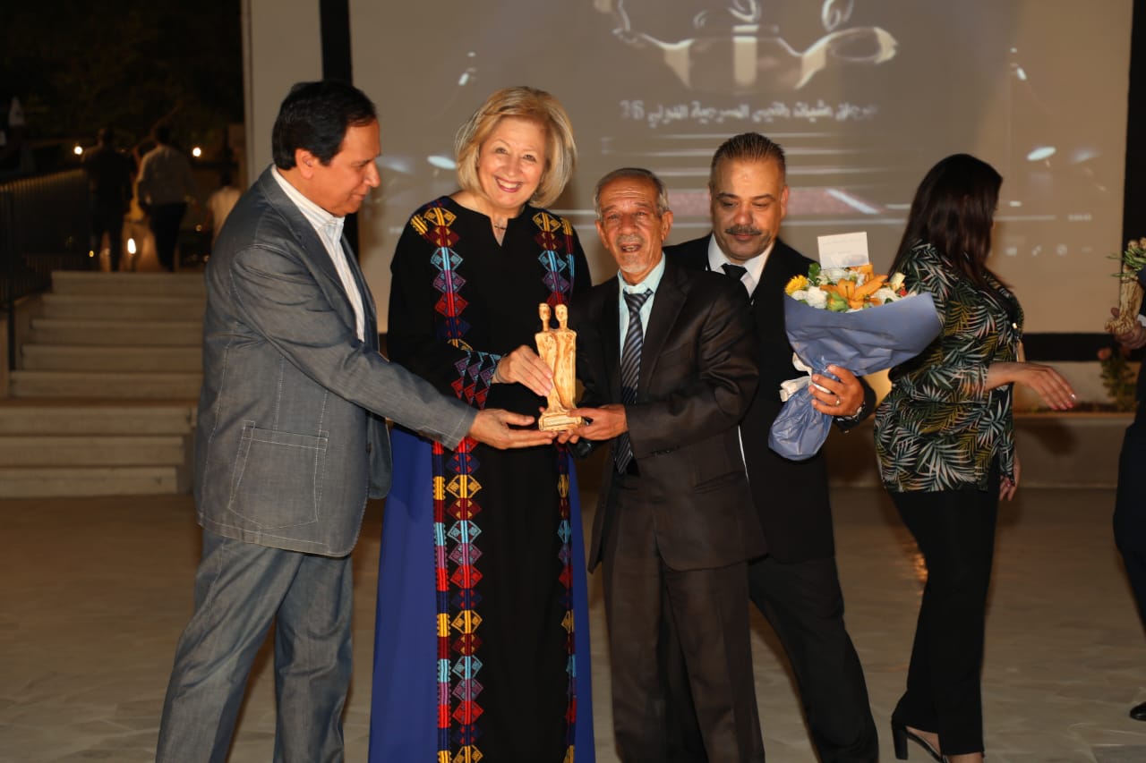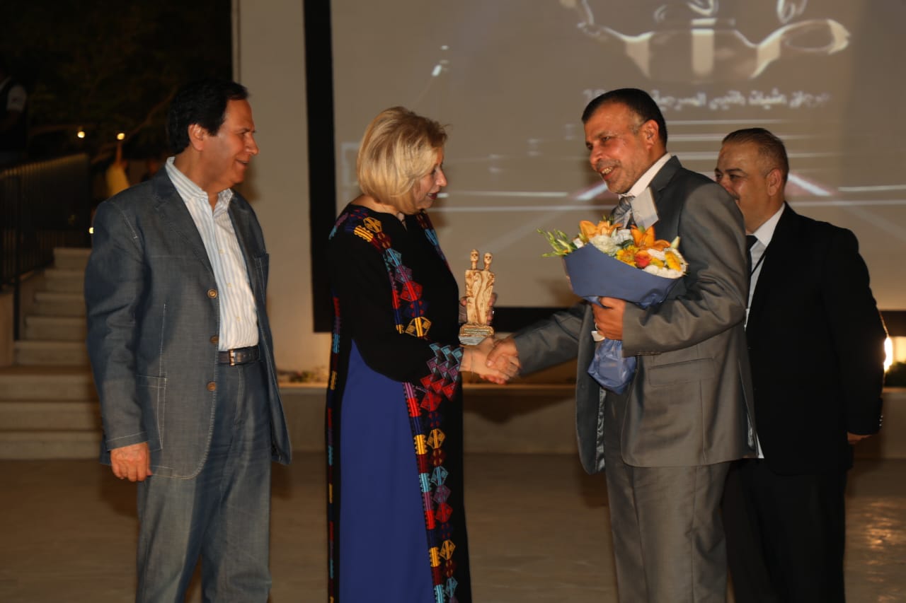 وسلمت النجار يصاحبها العبادي والريموني في ختام حفل الافتتاح، درعين تكريميين لشخصيتي المهرجان الفنان مازن عجاوي، والكاتب المسرحي رياض طبيشات.