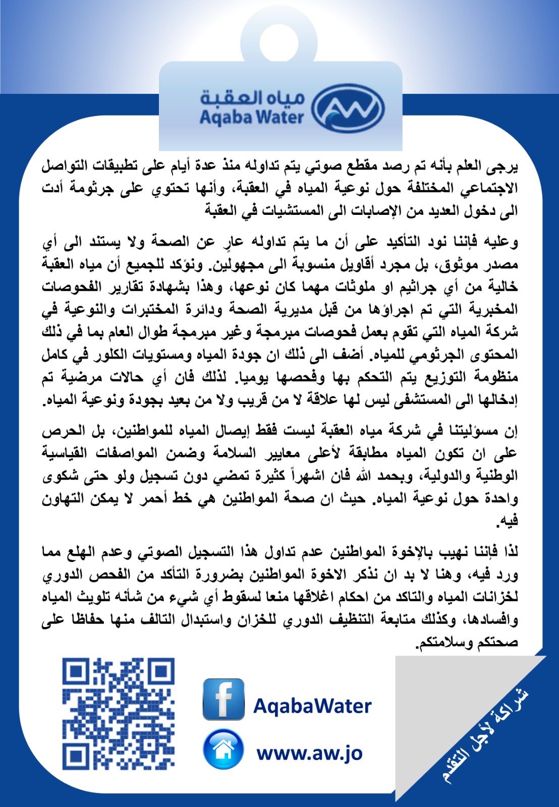 قالت شركة مياه العقبة انها رصدت مقطع صوتي متداول على تطبيقات التواصل الاجتماعي حول نوعية المياه في العقبة، وأنها تحتوي على جرثومة أدت الى دخول العديد من الإصابات الى المستشفيات في العقبة وهذا محض افتراء وعار عن الصحة تماما.