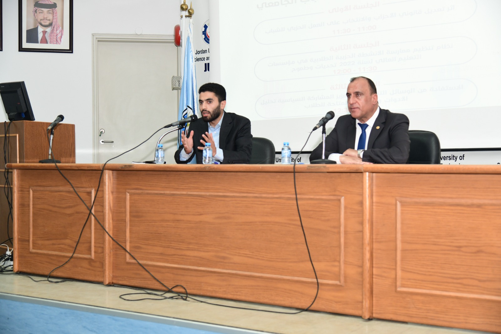 نظمت عمادة شؤون الطلبة في جامعة العلوم والتكنولوجيا الأردنية، بالتعاون مع برنامج أنا أشارك / الهيئة المستقلة للانتخاب، حوارية حول العمل الحزبي في منظور الشباب الجامعي، بهدف تمكين الشباب بالتشريعات الناظمة للعمل السياسي والبرامج العملية للأحزاب، للمُشاركة في الحياة السياسية.