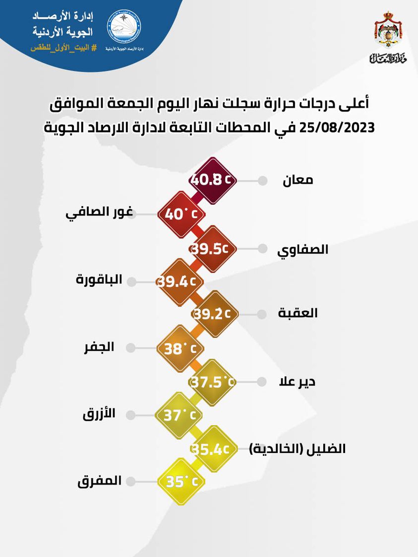 سجلت اليوم الجمعة أعلى درجات حرارة عظمى، على مستوى المملكة في المحطات التابعة لادارة الارصاد الجوبة، وكانت الأعلى في معان 40.8، وتليها غور الصافي40 ، والأزرق 44.6، والصفاوي 39.5، وفي الباقورة 39.4، والعقبة 39.2، الجفر 38، دير علا37.5، والأزرق 37، الضليل (الخالدية) 35.4، والمفرق 35