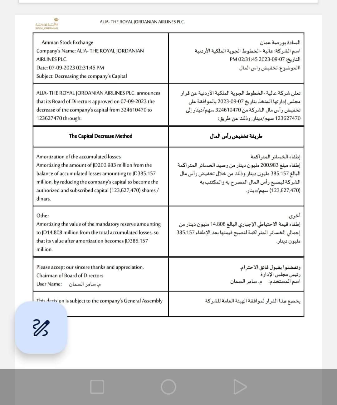 أعلنت شركة عالية- الخطوط الجوية الملكية الأردنية عبر هيئة الأوراق المالية عن قرار مجلس إدارتها المتخذ بتاريخ ٢٠٢٣/٩/٧ بالموافقة على تخفيض رأس مال الشركة من 324610470 سهم/دينار إلى 123627470 سهم/ دينار وذلك عن طريق إطفاء الخسائر المتراكمة حيث سيتم إطفاء مبلغ 200.983 مليون دينار وذلك من خلال تخفيض رأس مال الشركة ليصبح رأس المال المصرح به والمكاتب به 123.627.470 سهم/ دينار.