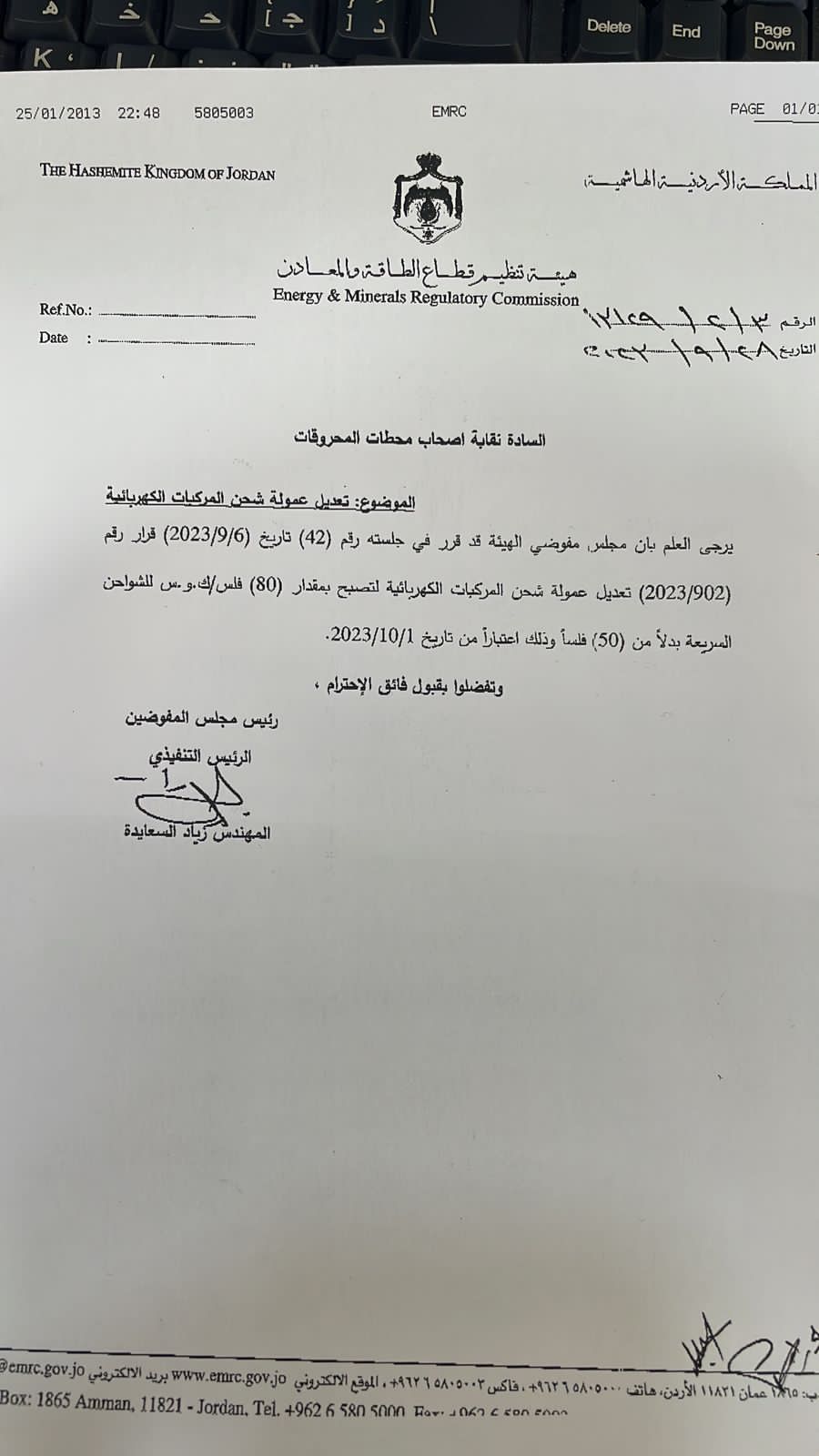 قرر مجلس مفوضي هيئة قطاع الطاقة والمعادن تعديل عمولة شحن المركبات الكهربائية لتصبح بمقدار 80فلس/ك.و.س للشواحن السريعة بدلا من 50 فلس اعتبارا من تاريخ 1/10/2023.