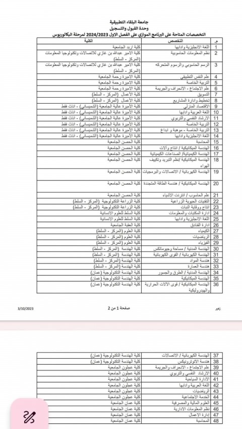 تخصصات شاغرة لبرنامج الموازي بالبلقاء التطبيقية