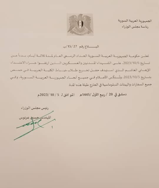 أعلنت الجمهورية العربية السورية الحداد العام لمدة 3 أيام على الضحايا المدنيين والعسكريين الذين ارتقوا بالاعتداء الإرهابي الذي استهدف تخريج طلاب الكلية الحربية بحمص.