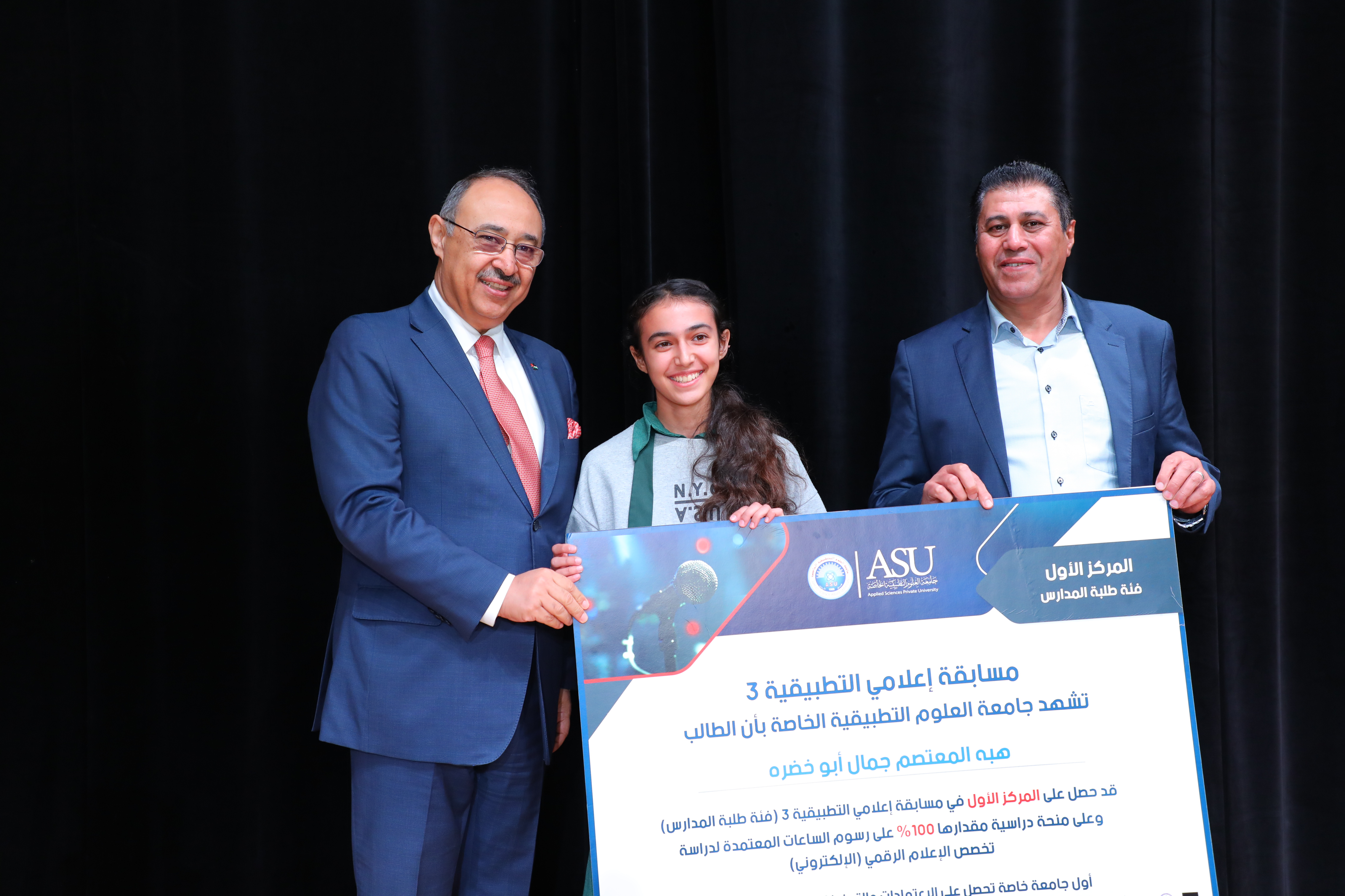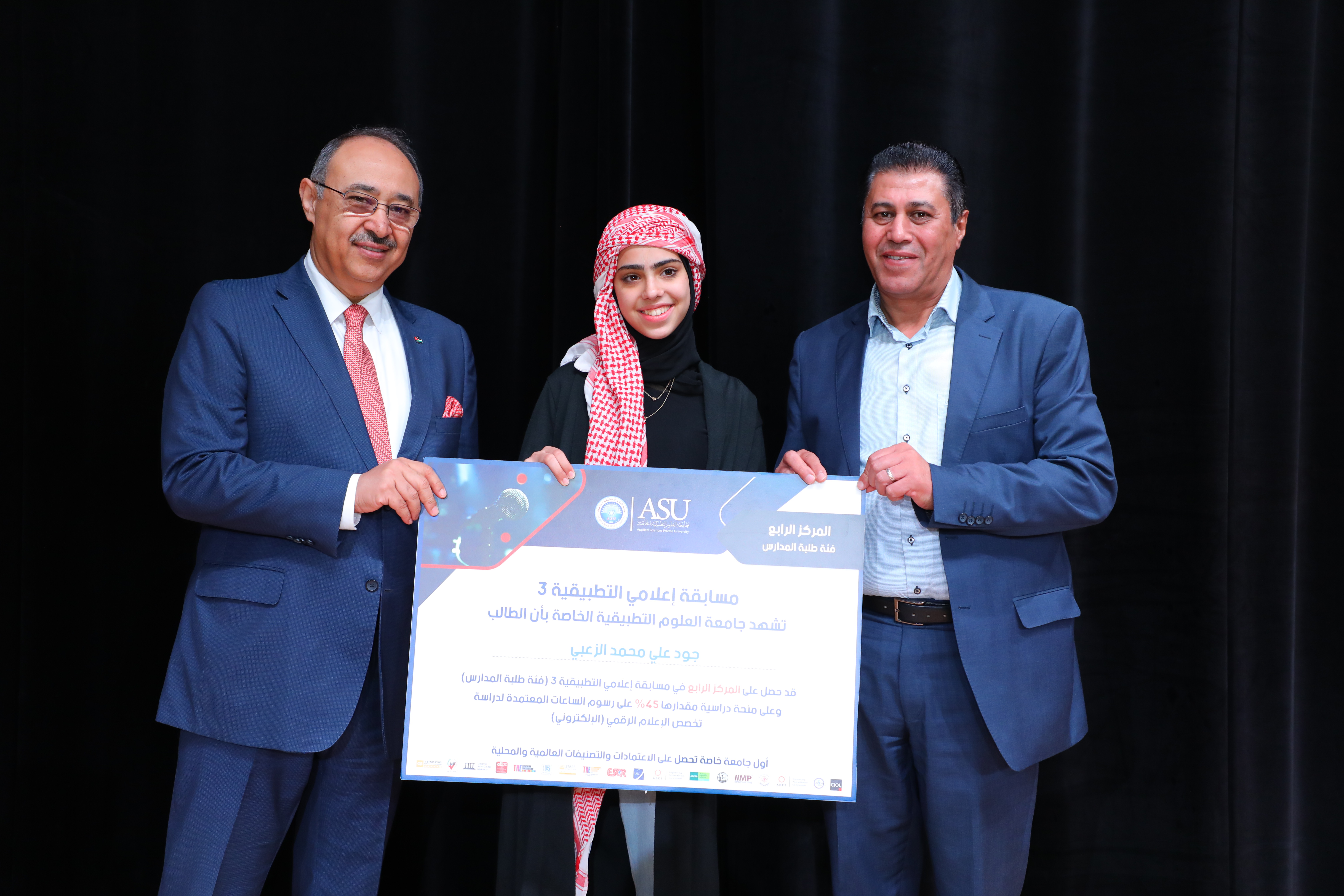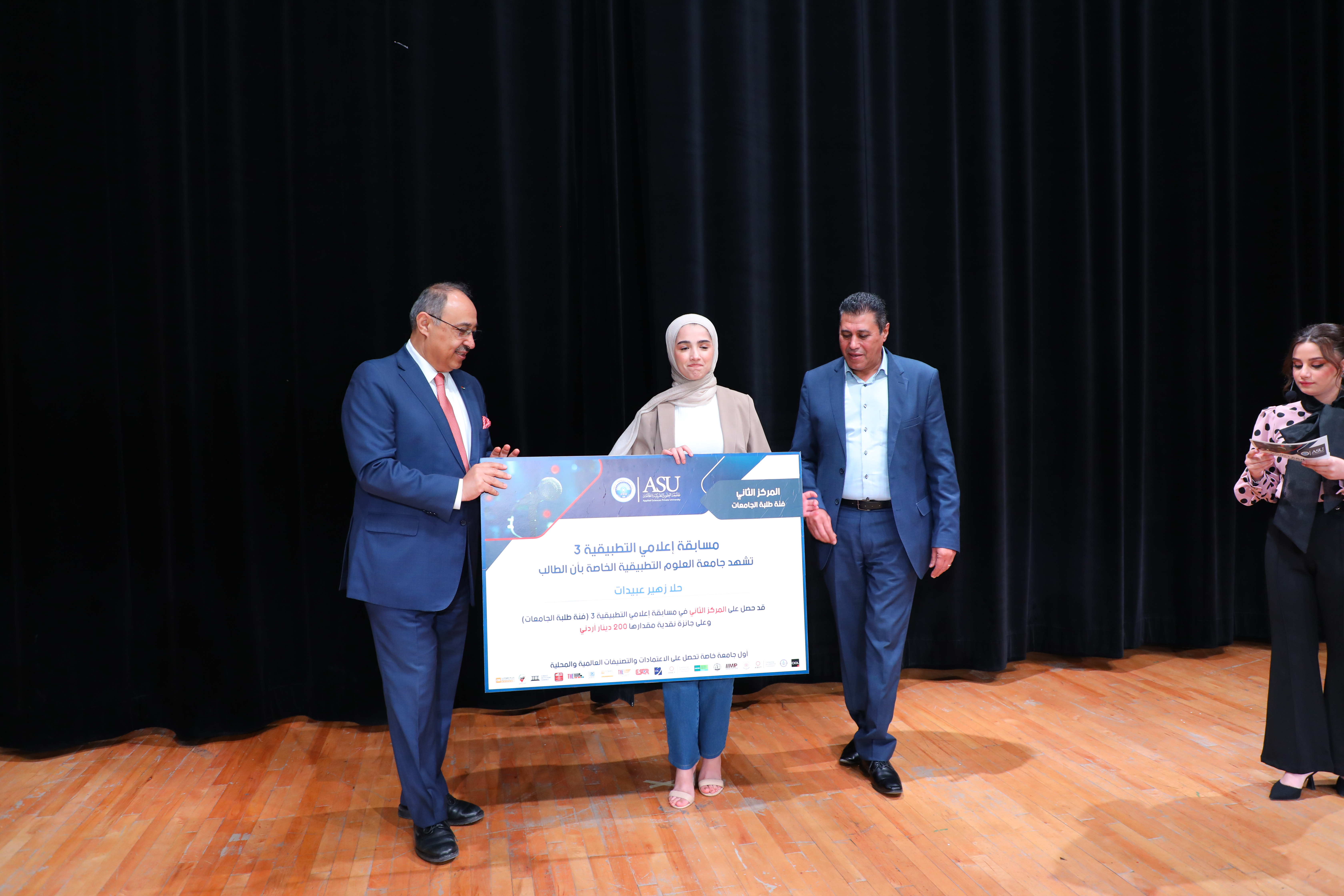 واختتم الحفل بإعلان نتائج المسابقة وتوزيع الجوائز على الفائزين والتي تمثلت بمنح دراسية كاملة وجزئية لدراسة تخصص الإعلام الرقمي بالتطبيقية للطلبة الفائزين على مستوى المدارس، وجوائز نقدية للطلبة الفائزين على مستوى الجامعات الأردنية، بالإضافة لتكريم لجنة التحكيم تقديراً لجهودهم، وتكريم ممثلي الجهات الإعلامية المختلفة الذين حضروا الحفل دعماً للمواهب الإعلامية الشابة.