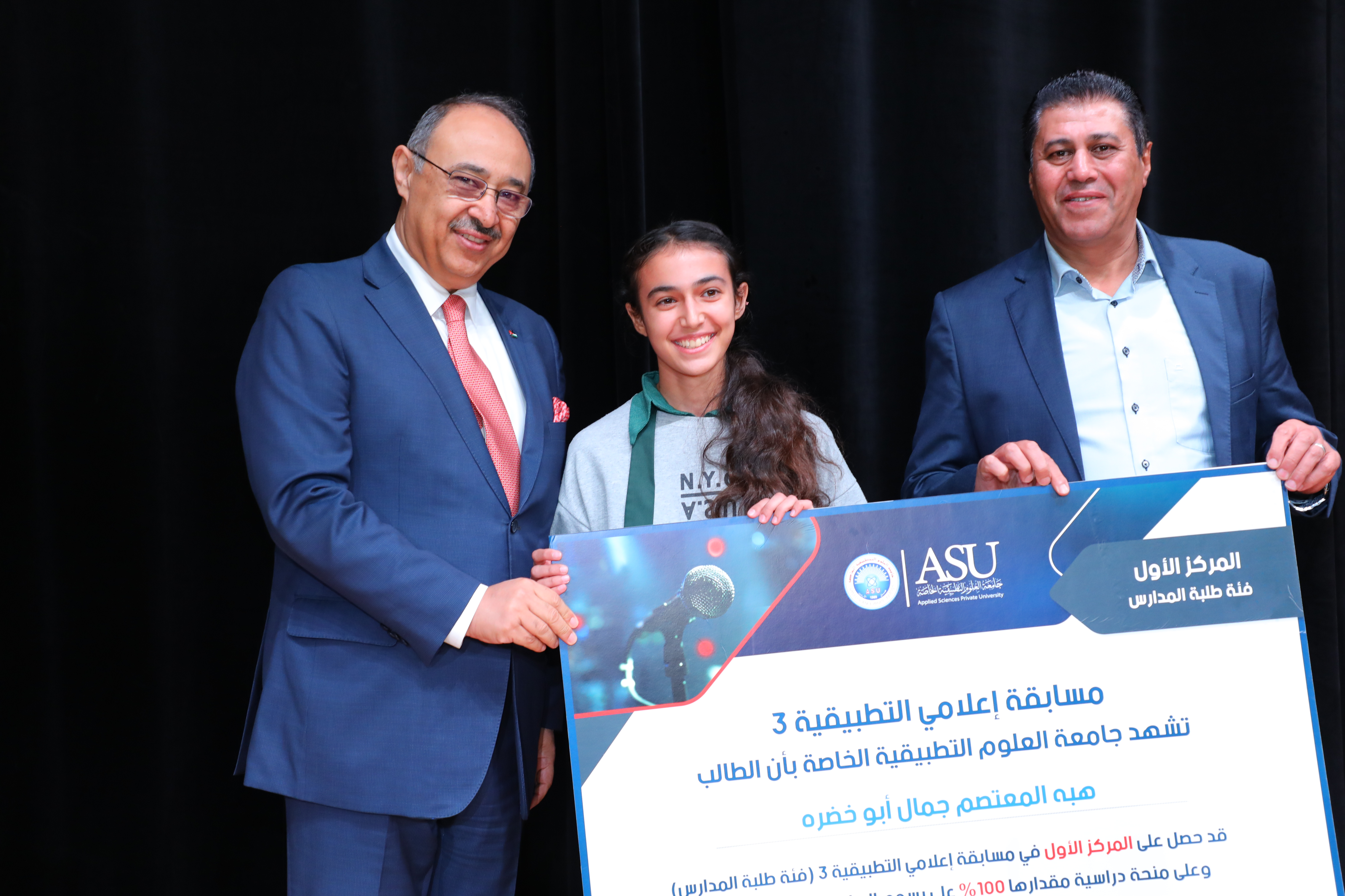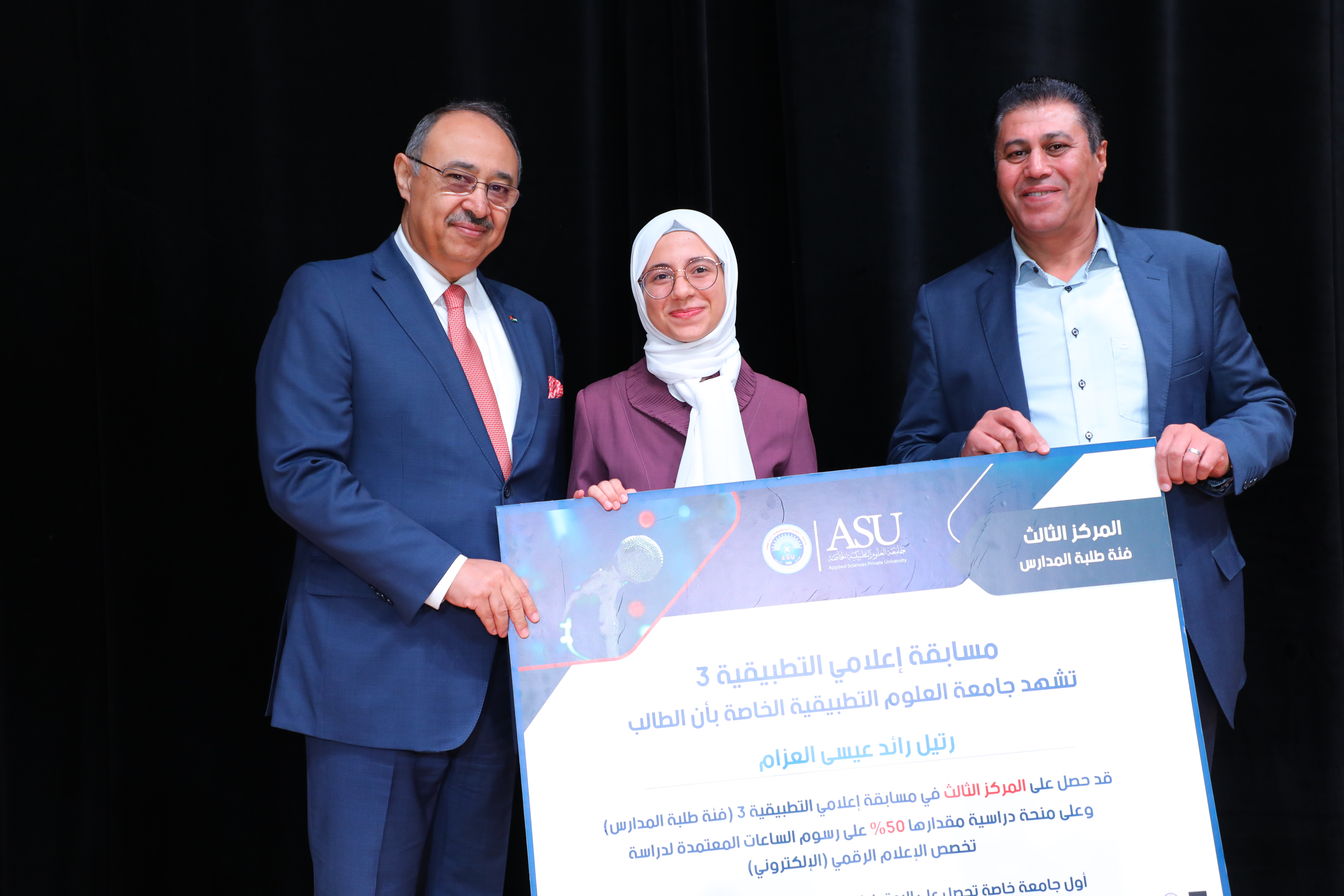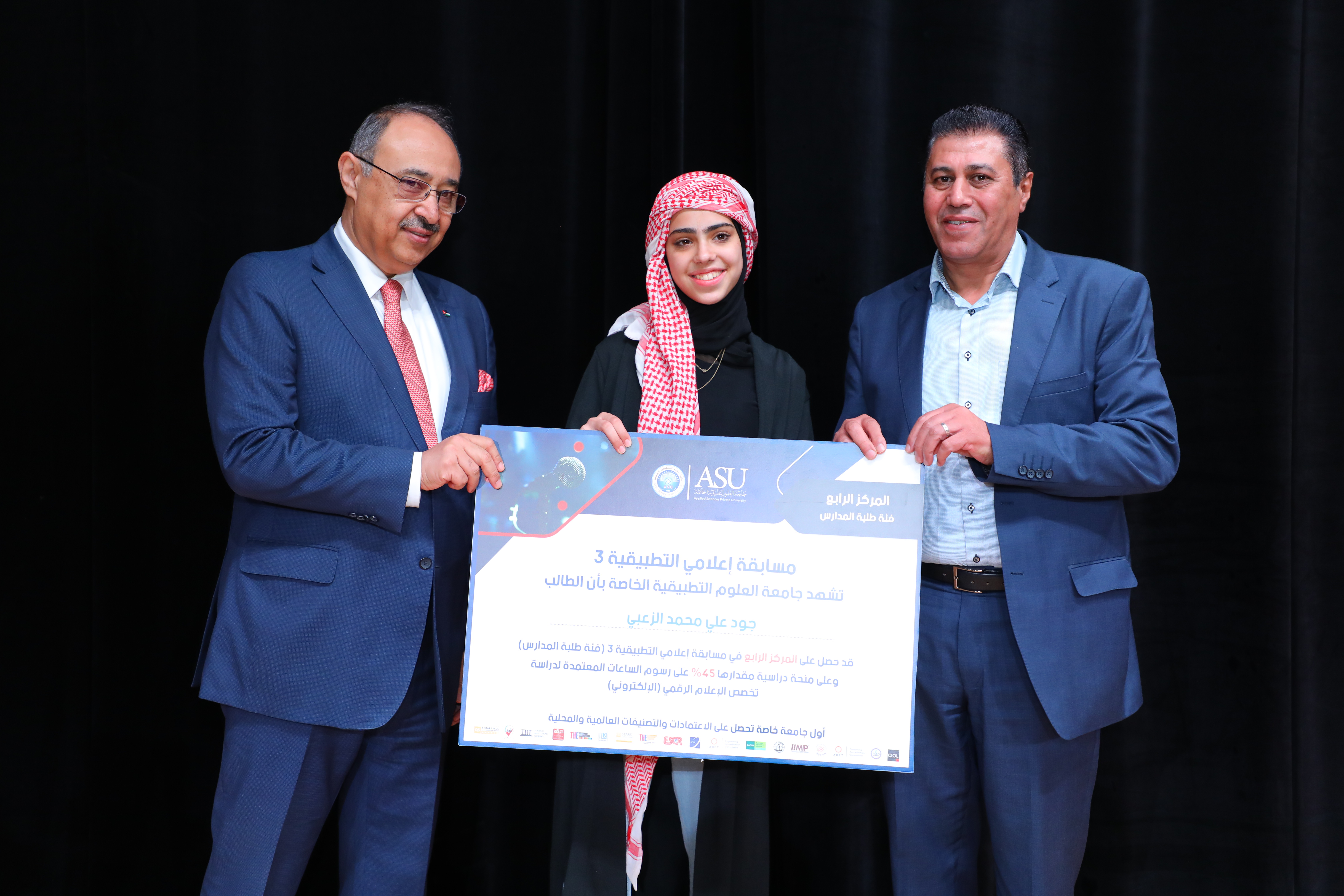واختتم الحفل بإعلان نتائج المسابقة وتوزيع الجوائز على الفائزين والتي تمثلت بمنح دراسية كاملة وجزئية لدراسة تخصص الإعلام الرقمي بالتطبيقية للطلبة الفائزين على مستوى المدارس، وجوائز نقدية للطلبة الفائزين على مستوى الجامعات الأردنية، بالإضافة لتكريم لجنة التحكيم تقديراً لجهودهم، وتكريم ممثلي الجهات الإعلامية المختلفة الذين حضروا الحفل دعماً للمواهب الإعلامية الشابة.