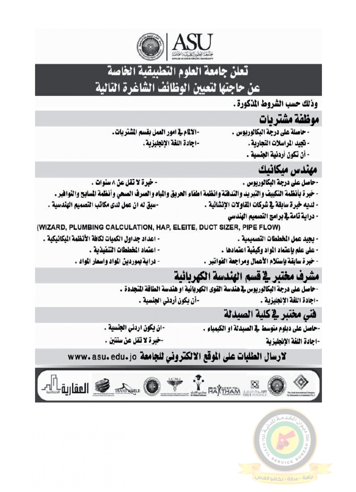 اعلن ديوان الخدمة عن توفر وظائف شاغرة في جامعة العلوم التطبيقية الخاصة، وتاليا الوظائف: