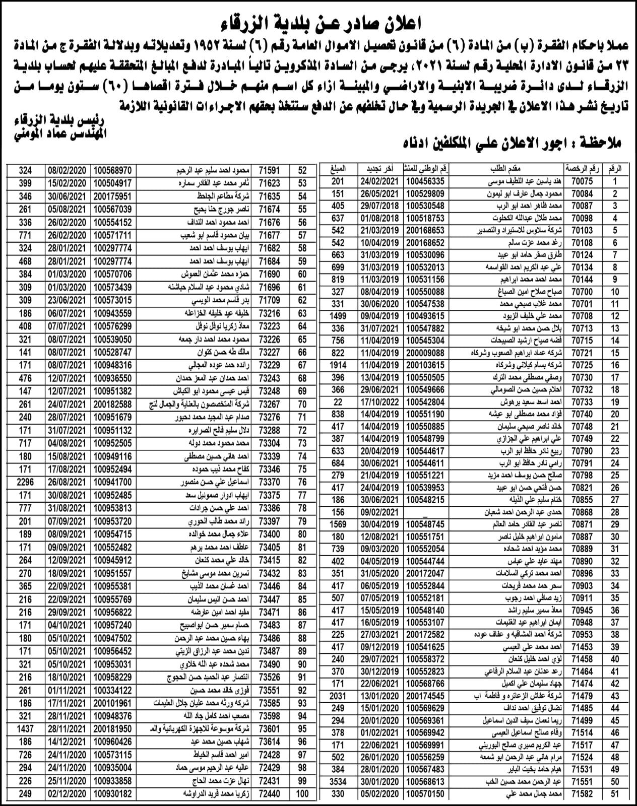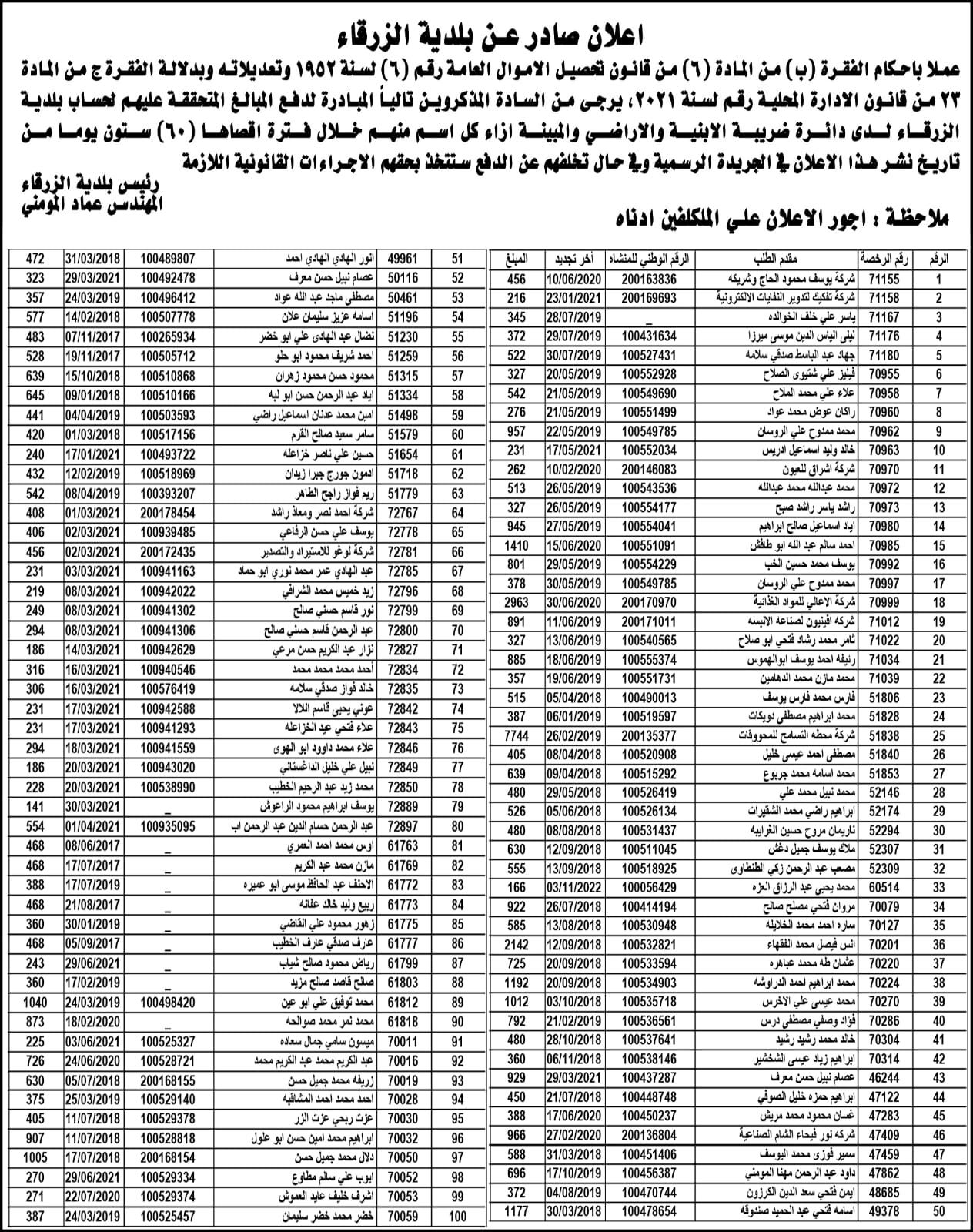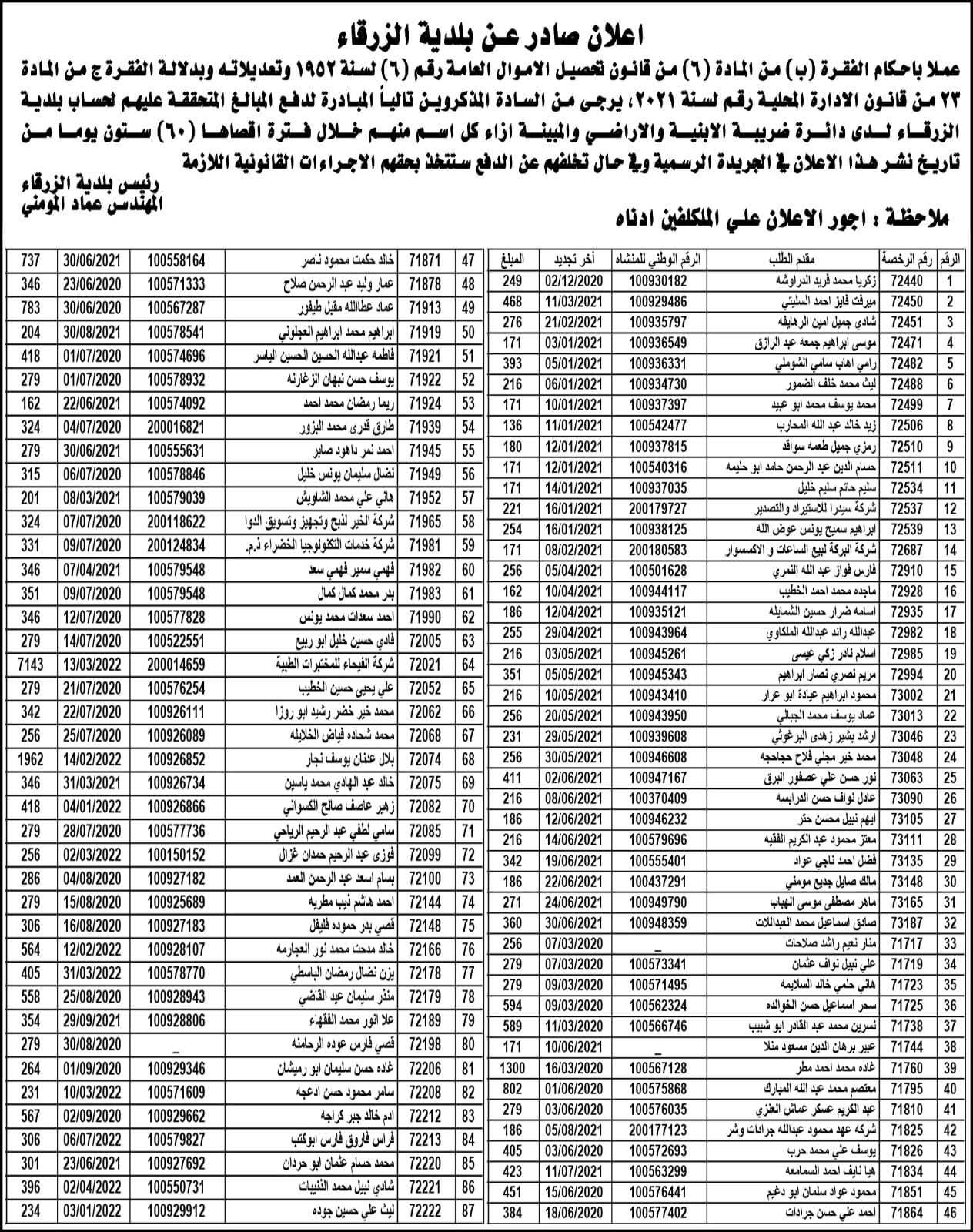 بلدية الزرقاء تنشر دفعة من اسماء الأشخاص المتخلفين عن دفع الضرائب