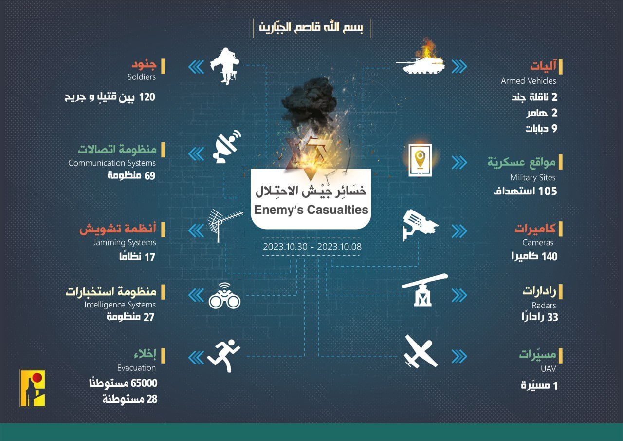 ونشر "حزب الله" اللبناني "إنفوغراف" عن "خسائر جيش الإحتلال الإسرائيلي عند الحدود اللبنانية الفلسطينية خلال 23 يوم من عمليات المقاومة الإسلامية على طريق القدس".