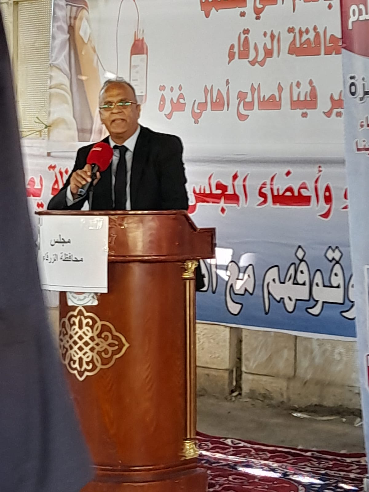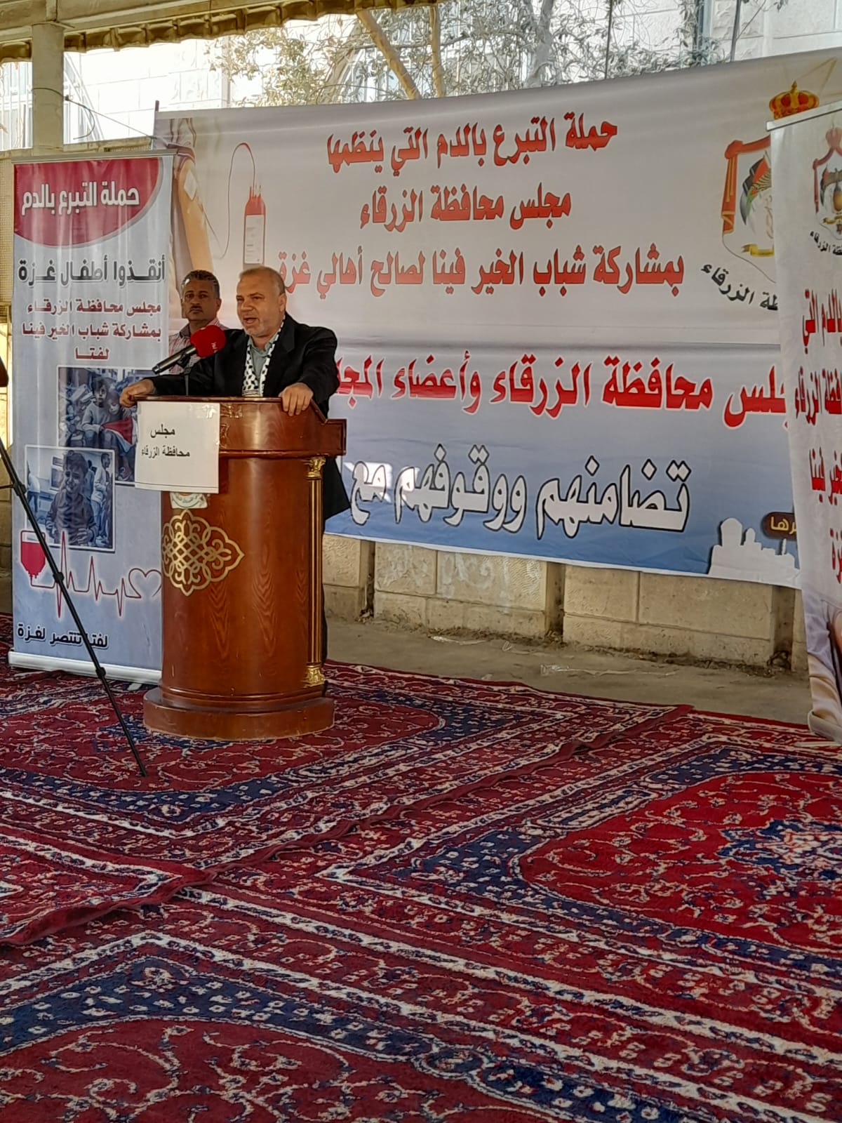 نظم مجلس محافظة الزرقاء بالتعاون مع بنك الدم وشباب الخير فينا حملة للتبرع بالدم للجرحى والمصابين من أهالي قطاع غزة الذين يواجهون أبشع جرائم الاحتلال الإسرائيلي أمام مبنى غرفة تجارة الزرقاء، بحضور النائب الأول لرئيس مجلس النواب الأسبق الدكتور أحمد الخلايلة، رئيس مجلس محافظة الزرقاء الدكتور ماجد الخضري، رئيس بلدية الزرقاء السابق المهندس علي أبو السكر، مدير أوقاف محافظة الزرقاء الدكتور احمد الحراحشة، رئيس اتحاد الجمعيات الخيرية في محافظة الزرقاء محمد المجالي، رئيس مجلس محلي أمن الغويرية ورجل الأعمال جهاد السموعي، مدير التطوير التربوي في مديرية تربية الزرقاء الأولى عامر الوظائفي، سعادة النائب محمد موسى الغويري، سعادة النائب الدكتور هايل عياش، النائبين السابقين محمد الحجوج ومنصور مراد وجمع كبير من المواطنين.