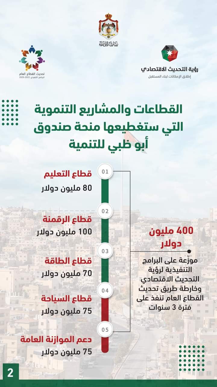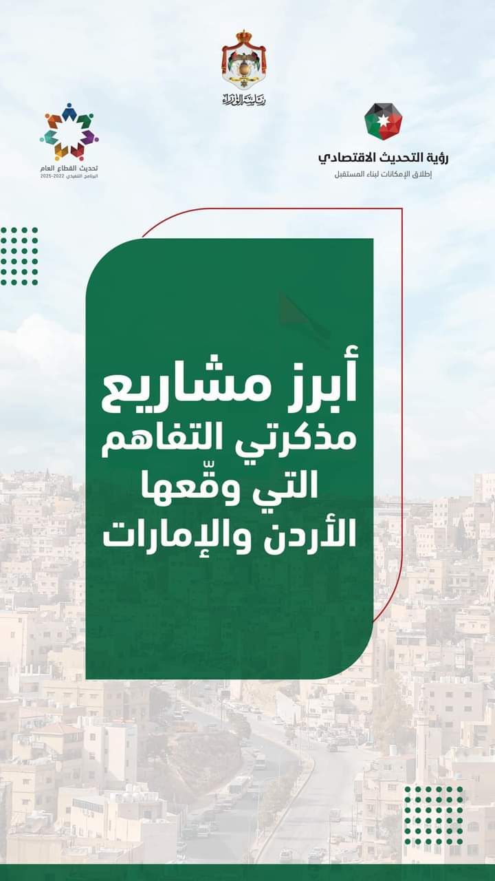 تهدف مذكرات التفاهم التي تم توقيعها خلال زيارة جلالة الملك عبدالله الثاني إلى دولة الإمارات العربية المتحدة الشقيقة لتعزيز التعاون في المشاريع التنموية والبنية التحتية، من خلال تمويل تنفيذ عدد من البرامج والمشاريع ذات الأولوية ضمن البرنامج التنفيذي لرؤية التحديث الاقتصادي (2023-2025)، والبرنامج التنفيذي لتحديث القطاع العام خلال فترة 3-5 سنوات.