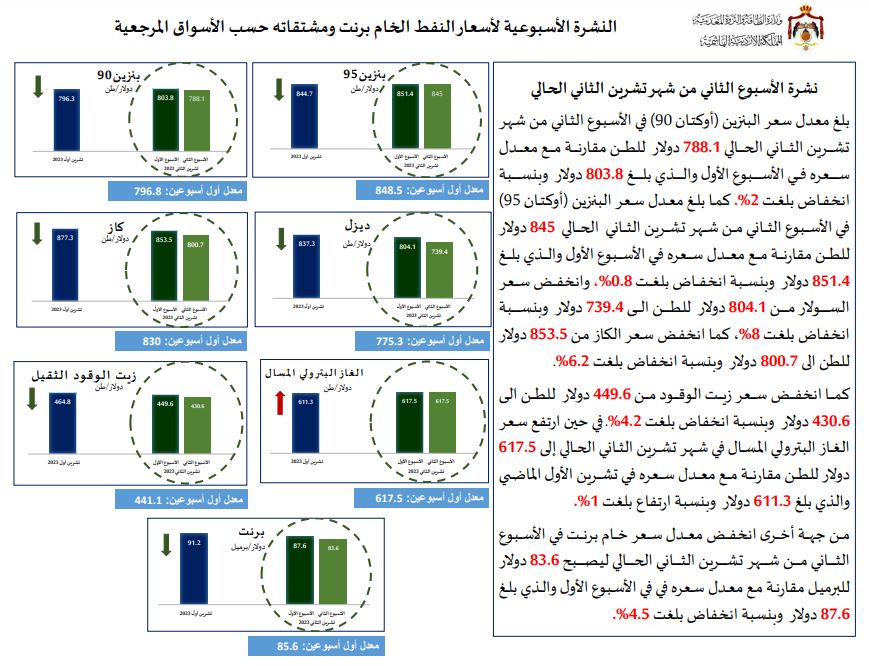 انخفضت أسعار المشتقات النفطية عالميا خلال الأسبوع الثاني من شهر تشرين الثاني الحالي، مقارنة مع معدل أسعارها للأسبوع الأول، بحسب بيانات أعلنتها وزارة الطاقة والثروة المعدنية اليوم الأحد.