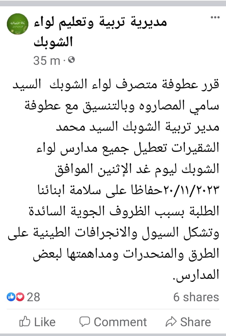 قرر عطوفة متصرف لواء الشوبك السيد سامي المصاروه وبالتنسيق مع عطوفة مدير تربية الشوبك السيد محمد الشقيرات تعطيل جميع مدارس لواء الشوبك ليوم الإثنين الموافق ٢٠/١١/٢٠٢٣حفاظا على سلامة ابنائنا الطلبة بسبب الظروف الجوية السائدة وتشكل السيول والانجرافات الطينية على الطرق والمنحدرات ومداهمتها لبعض المدارس.