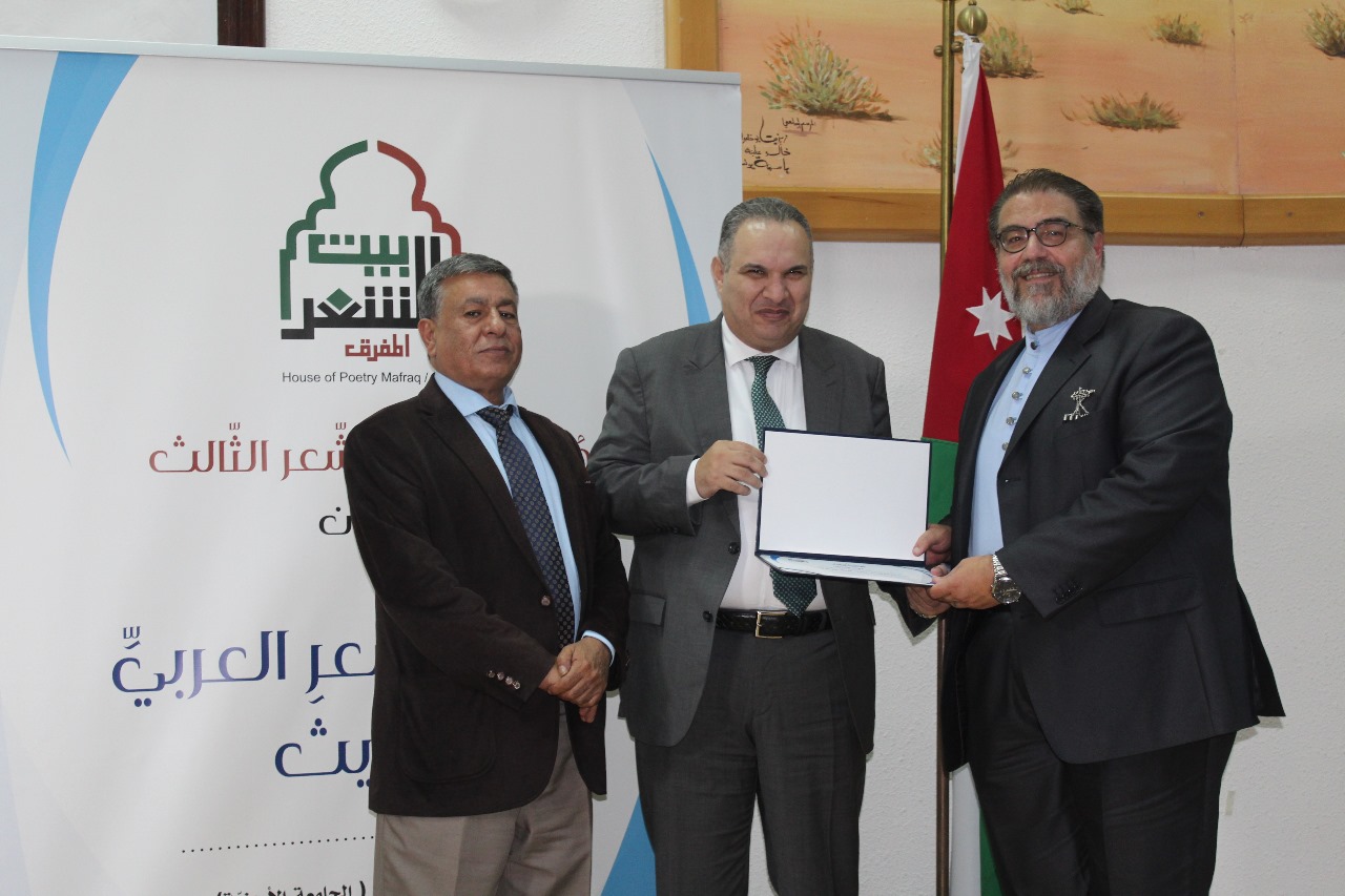 نائب رئيس الجامعة الدكتور زياد الحوامدة ألقى كلمة أكد من خلالها على أهمية التشاركية بين الجامعة وبيت الشعر بالمفرق من خلال طرح قضايا الشعر الحديث وبمشاركة من النقاد الأردنيين ومعاينتهم الشعر وقضاياه، مثمنا مبادرة سمو الشيخ الدكتور سلطان بن محمد القاسمي حاكم الشارقة بنشر بيوت الشعر في الوطن العربي ودعم الثقافة والمبدعين.