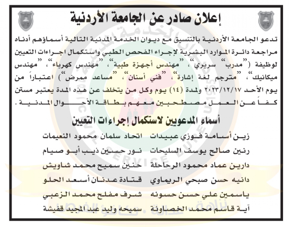تدعو الجامعة الاردنية بالتنسيق مع ديوان الخدمة الخدمة المدنية، التالية اسماؤهم الى مراجعة دائرة الموارد البشرية لاجراء فحص طبي واستكمال اجراءات التعيين لوظيفة مدرب سريري، مهندس اجهزة طبية، مهندس كهرباء، مهندس ميكانيك، مترجم لغة اشارة ، فني اسنان، ومساعد ممرض، وذلك اعتبارا من يوم الاحد 17/12/2023 ولمدة (14) يوم، وكل من يتخلف عن هذه المدة يعتبر مسن كفا عن العمل مصطحبين معهم بطاقة الاحوال المدنية.
