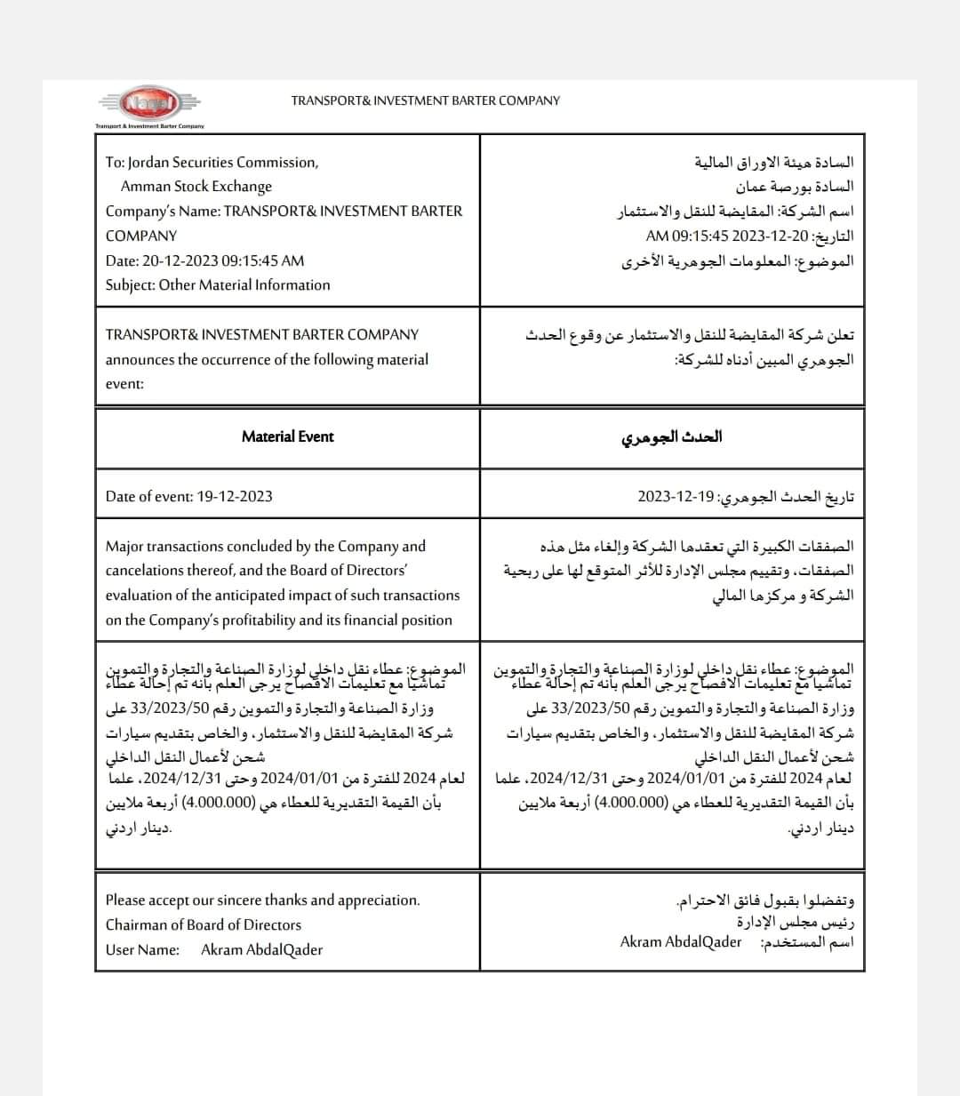 أعلنت شركة المقايضة للنقل والاستثمار بافصاح لها عبر هيئة الأوراق المالية عن وقوع حدث جوهري بحصولها على عطاء داخلي لوزارة الصناعة والتجارة والتموين رقم 33/2023/50 والخاص بتقديم سيارات شحن لأعمال النقل الداخلي لعام 2024 للفترة ما بيت 2024/1/1 وحتى 2024/12/31 علما بأن القيمة التقديرية للعطاء هي 4000000 أربعة ملايين دينار أردني.