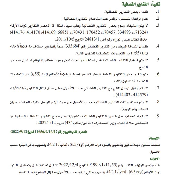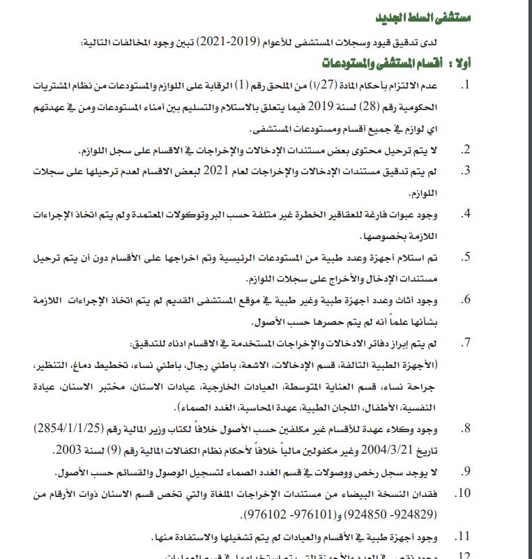 وبين التقرير أنه تم استلام أجهزة وعدد طبي من المستودعات الرئيسية وتم إخراجها على الأقسام دون أن يتم ترحيل مستندات الإدخال والإخراج على سجلات اللوازم. وتاليا بعض المخالفات الواردة في التقرير: وجود أثاث وعدد أجهزة طبية وغير طبية في موقع المستشفى القديم لم يتم اتخاذ الإجراءات اللازمة بشأنها علماً أنه لم يتم حصرها حسب الأصول.