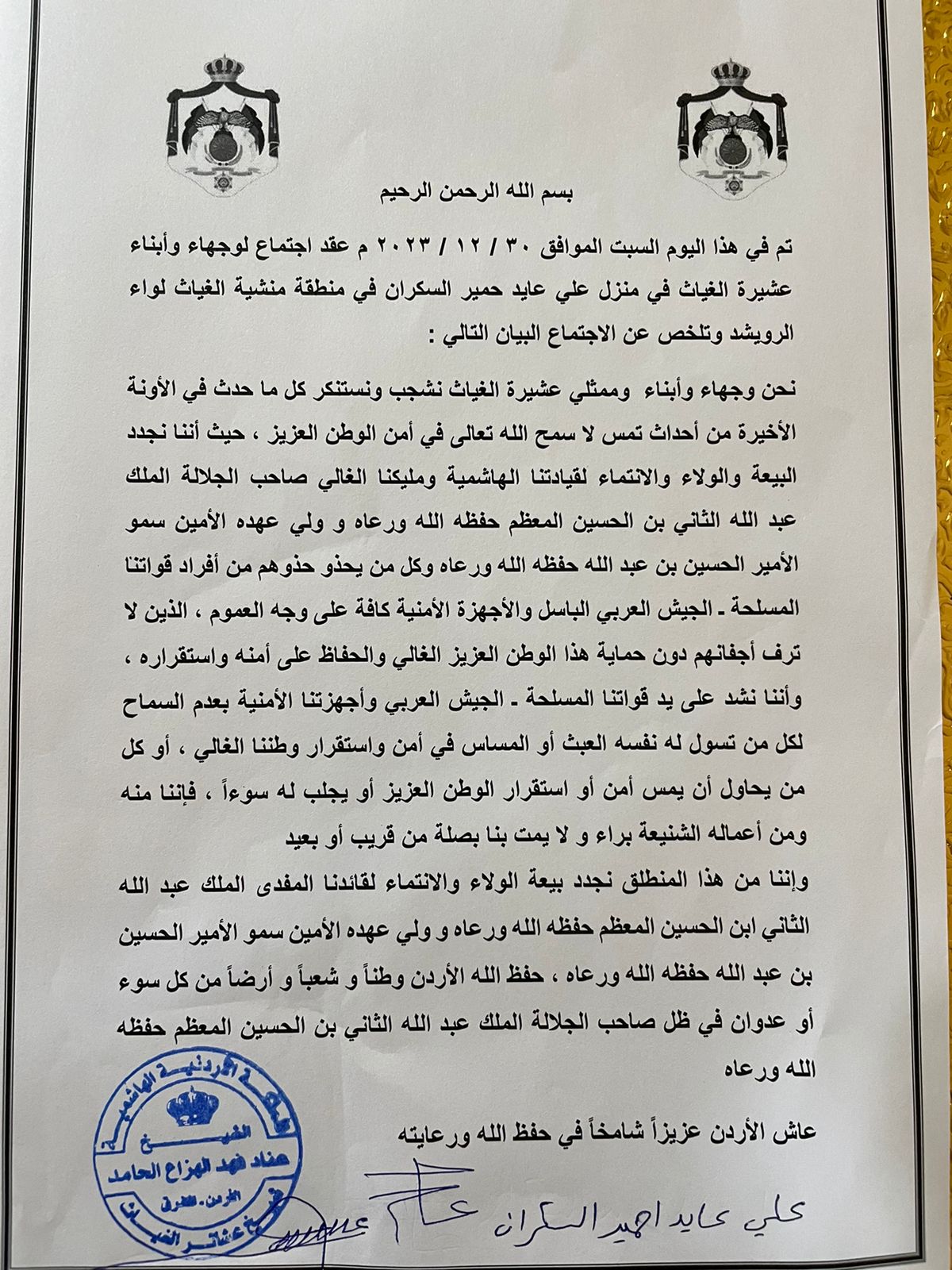 أصدر وجهاء وأبناء عشيرة الغياث في منطقة منشية الغياث بالرويشد البيان التالي :