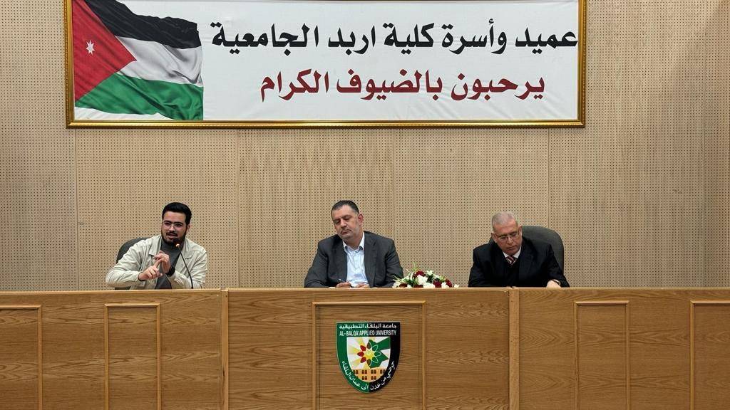 ورحب عميد كلية اربد الجامعية الدكتور يحيى سلامة خريسات في بداية اللقاء بالأمين العام لحزب إرادة ومبادرته لتلبية الدعوة للمشاركة بهذه الندوة التوعوية لأهمية المشاركة في الأحزاب مؤكداً حرص الكلية على توعية الشباب بأهمية المشاركة في الأحزاب تنفيذاً للرؤية الملكي السامية في هذا المجال.