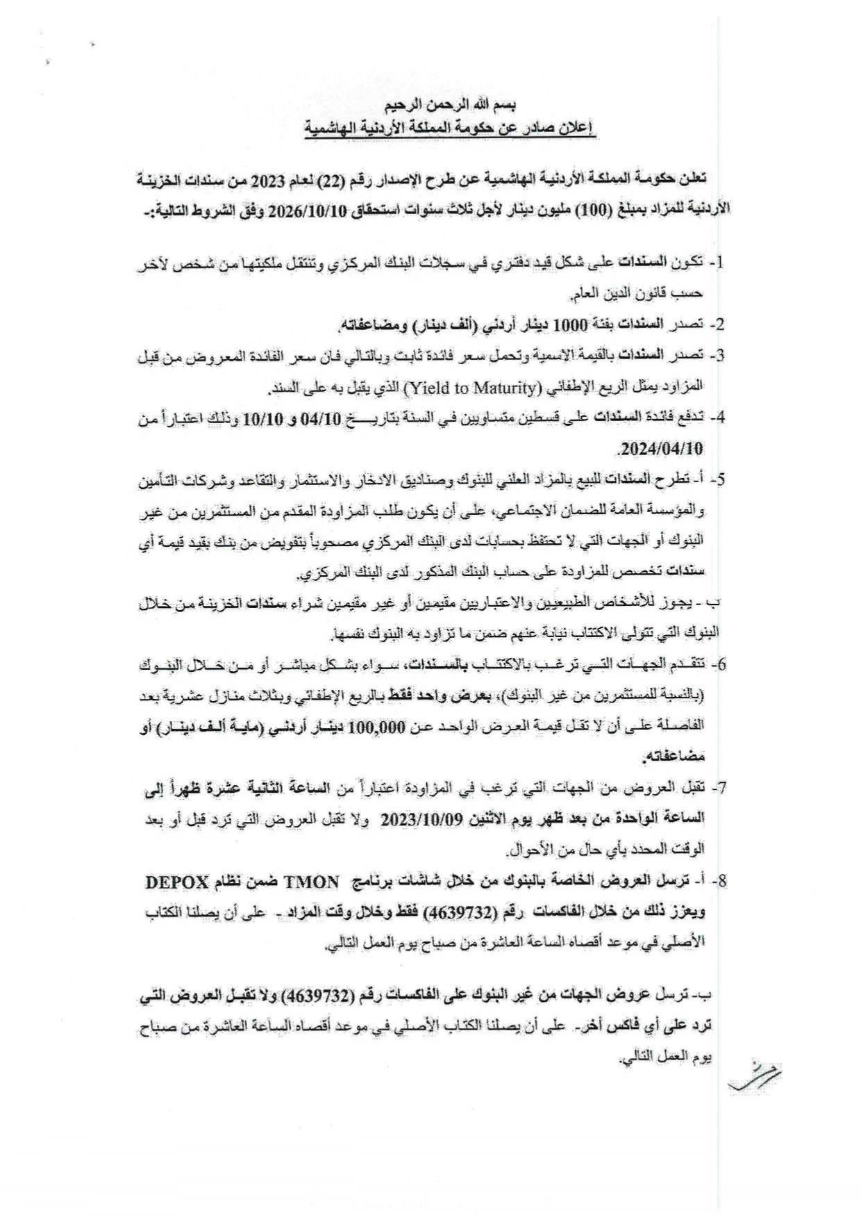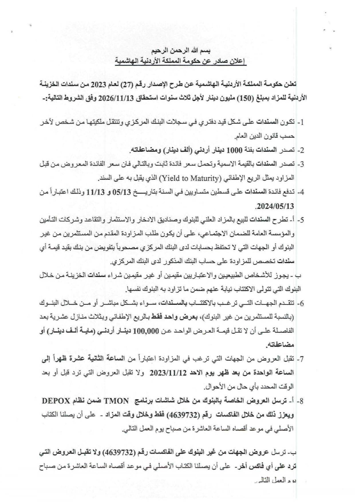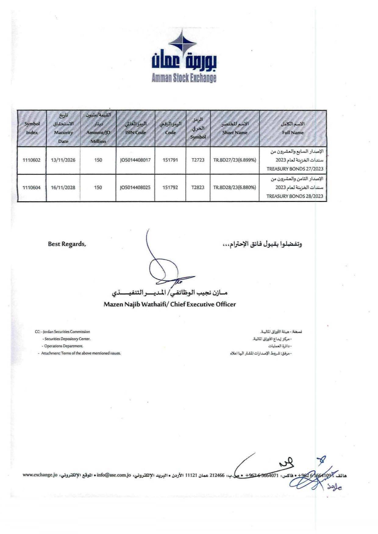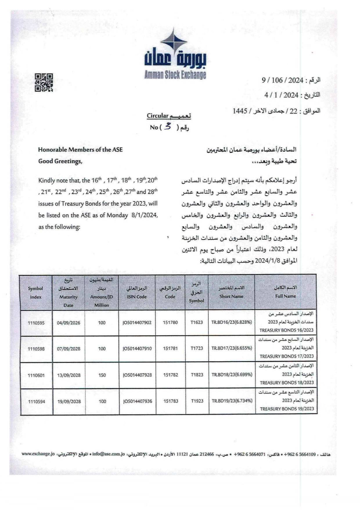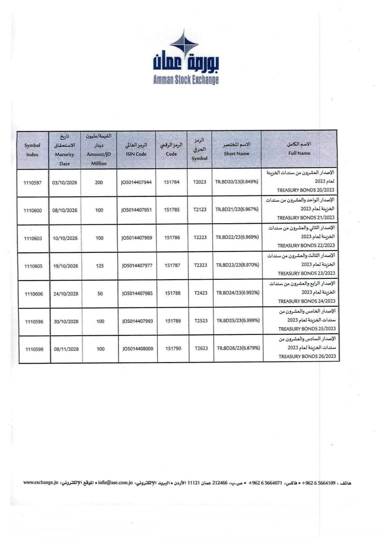 أعلنت بورصة عمّان، إدراج عدد من إصدارات سندات الخزينة عن العام الماضي 2023، وذلك اعتباراً من صباح غد الاثنين.