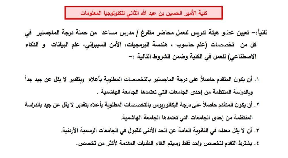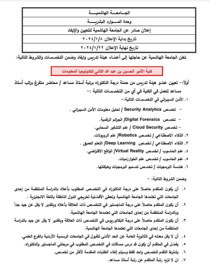 أعلنت الجامعة الهاشمية اليوم الاثنين عن حاجتها لتعيين اعضاء هيئة تدريس في كلية الامير الحسين بن عبد الله الثاني لتكنولوجيا المعلومات من حملة درجتي الدكتوراه والماجستير وفي كلية طب الاسنان من حملة درجتي الدكتوراه والماجستير وايفاد لصالح كلية العلوم الصيدلانية. https://hu.edu.jo/unitCenter/?unitid=30000000