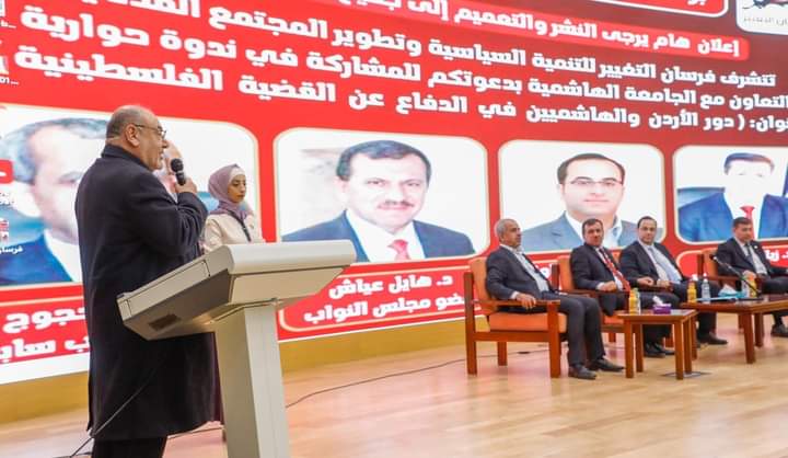 وليد حماد- تحت رعاية السيد فيصل الفايز رئيس مجلس الأعيان نظمت الجامعة الهاشمية بالتعاون مع جمعية فرسان التغيير للتنمية السياسية وتطوير المجتمع المدني ندوة حوارية بعنوان "دور الأردن والهاشميين في الدفاع عن القضية الفلسطينية" في مدرج الكرامة، ويأتي تنظيم هذه الندوة ضمن الحملة الوطنية التي أطلقتها الجمعية تحت شعار "بوصلتنا فلسطين وتاجها القدس".