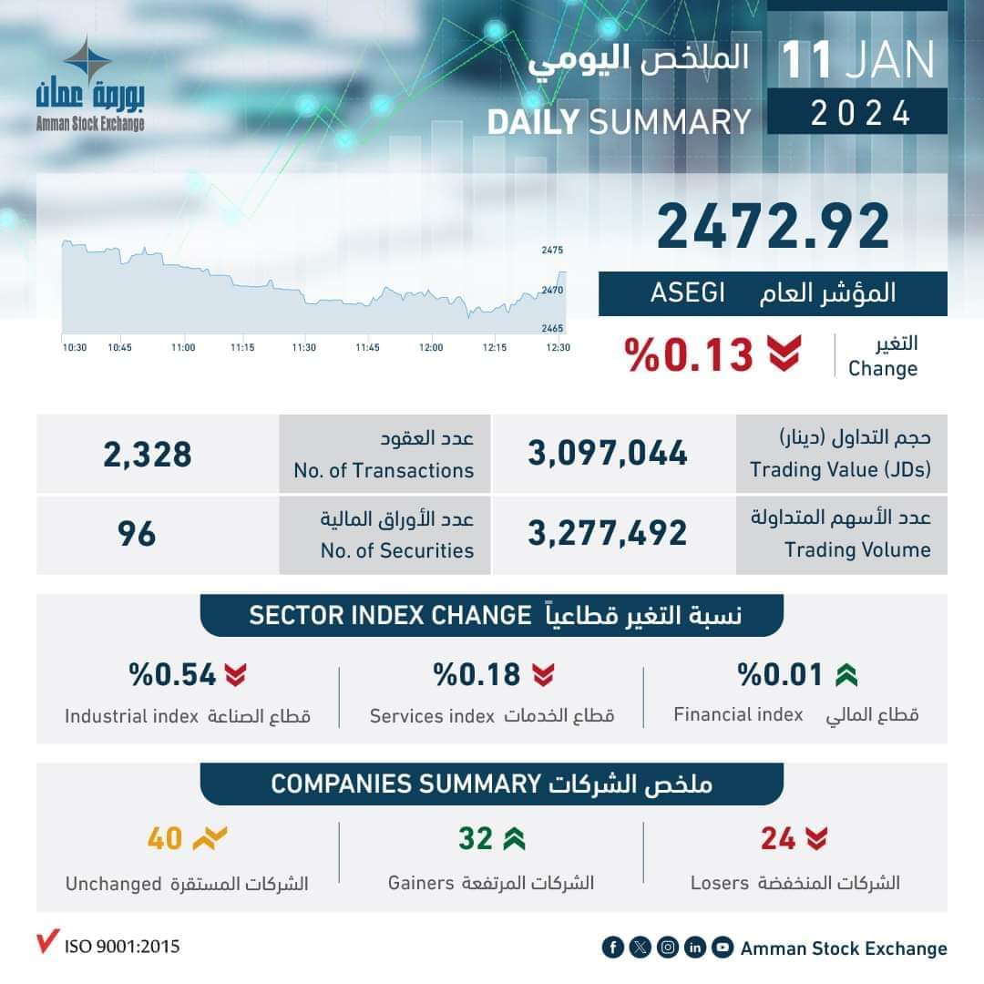 بلغ حجم التداول الإجمالي ليوم الخميس 11/01/2024 حوالي (3.1) مليون دينار وعدد الأسهم المتداولة (3.3) مليون سهم، نفذت من خلال (2,328) عقداً.