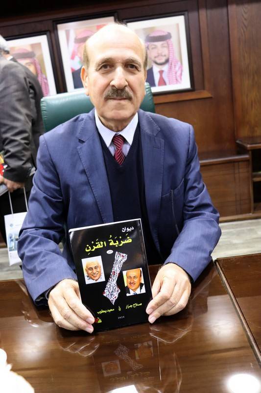أشهر الكاتبان الدكتور صلاح جرار وسعيد يعقوب، في دائرة المكتبة الوطنية بعمان، ديوانهما الشعري المشترك "ضربة القرن"، بحضور حشد من المهتمين والأكاديميين.