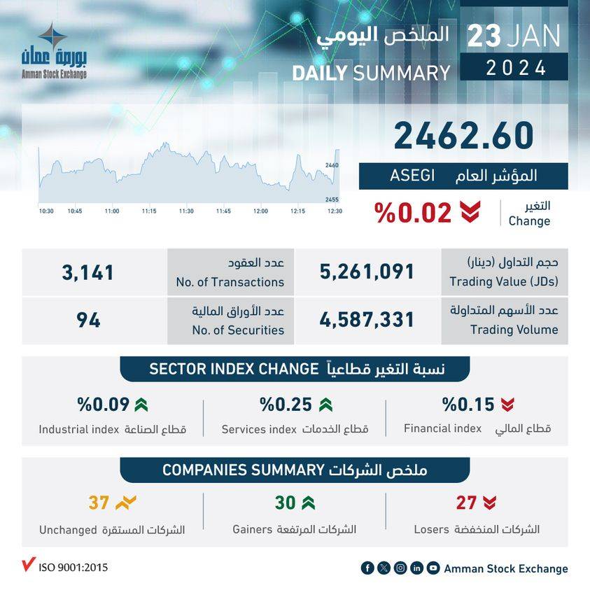 بلغ حجم التداول الإجمالي ليوم الثلاثاء 23/01/2024 حوالي (5.3) مليون دينار وعدد الأسهم المتداولة (4.6) مليون سهم، نفذت من خلال (3,141) عقداً.