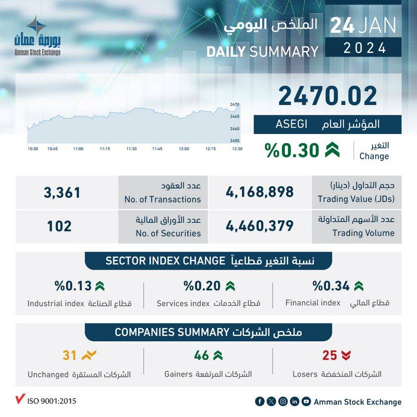 بلغ حجم التداول الإجمالي ليوم الأربعاء 24/01/2024 حوالي (4.2) مليون دينار وعدد الأسهم المتداولة (4.5) مليون سهم، نفذت من خلال (3,361) عقداً.