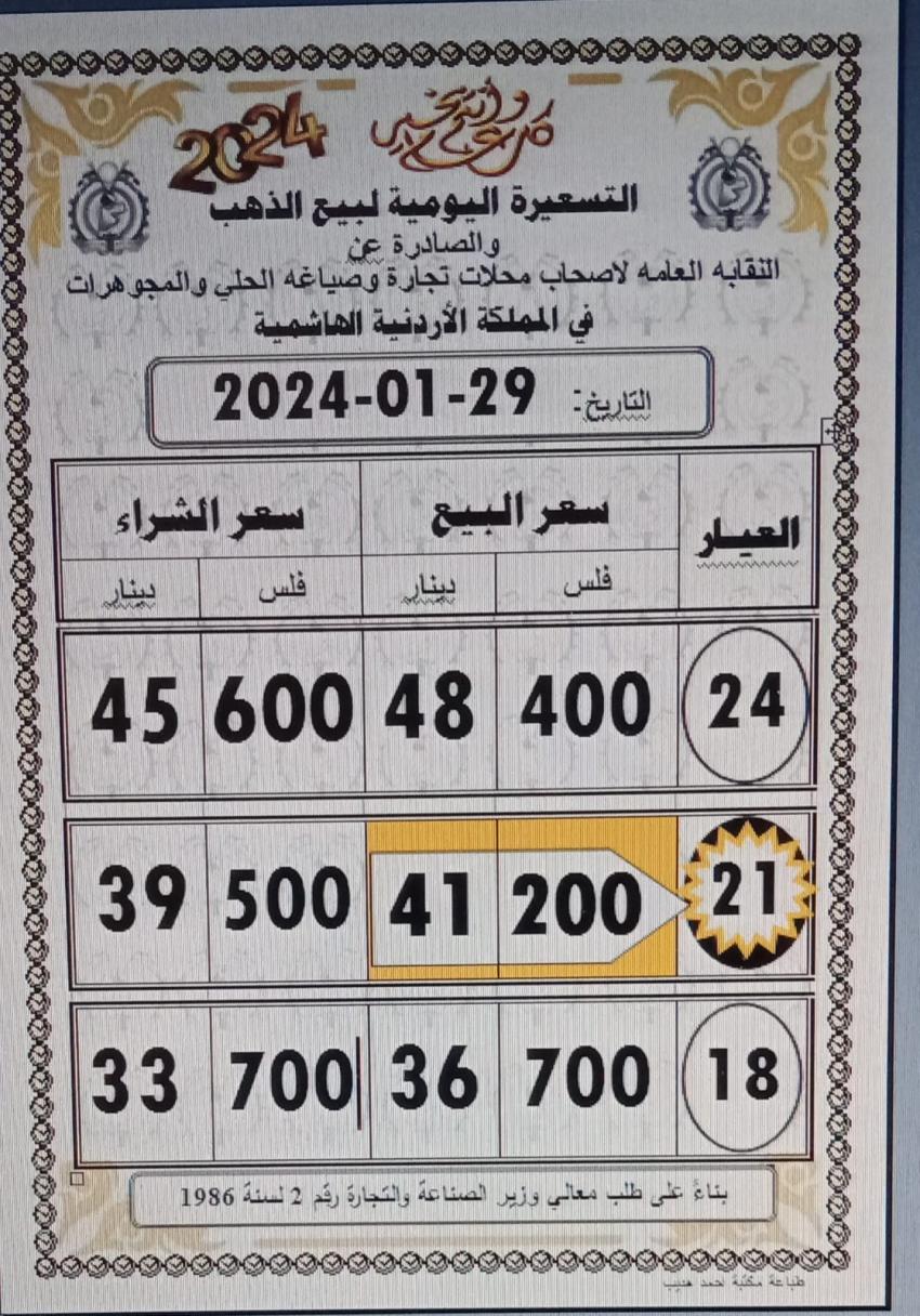وبلغ سعر بيع الذهب عيار 24 إلى 48.40 دينارا، فيما بلغ سعر بيع الذهب عيار 18 إلى 36.70 دينارا.