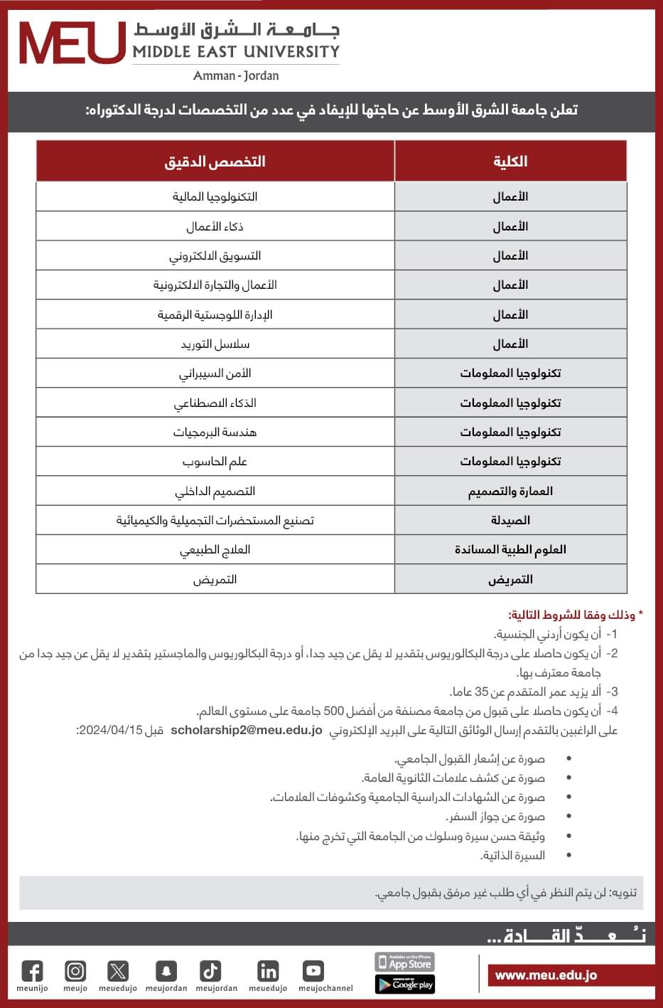 أعلنت جامعة الشرق الأوسط عن حاجتها للإيفاد في عدد من التخصصات لدرجة الدكتوراة.