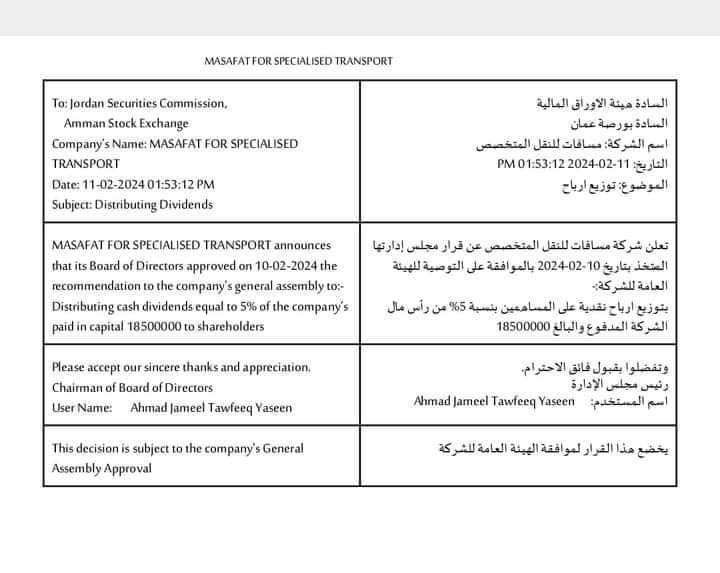 أعلنت شركة مسافات النقل المتخصص عن قرار مجلس ادارتها المتخذ بتاريخ 10-02-2024 بالموافقة على التوصية للهيئة العامة للشركة بتوزيع أرباح نقدية على المساهمين بنسبة 5% من راس مال الشركة المدفوع البالغ 18500000
